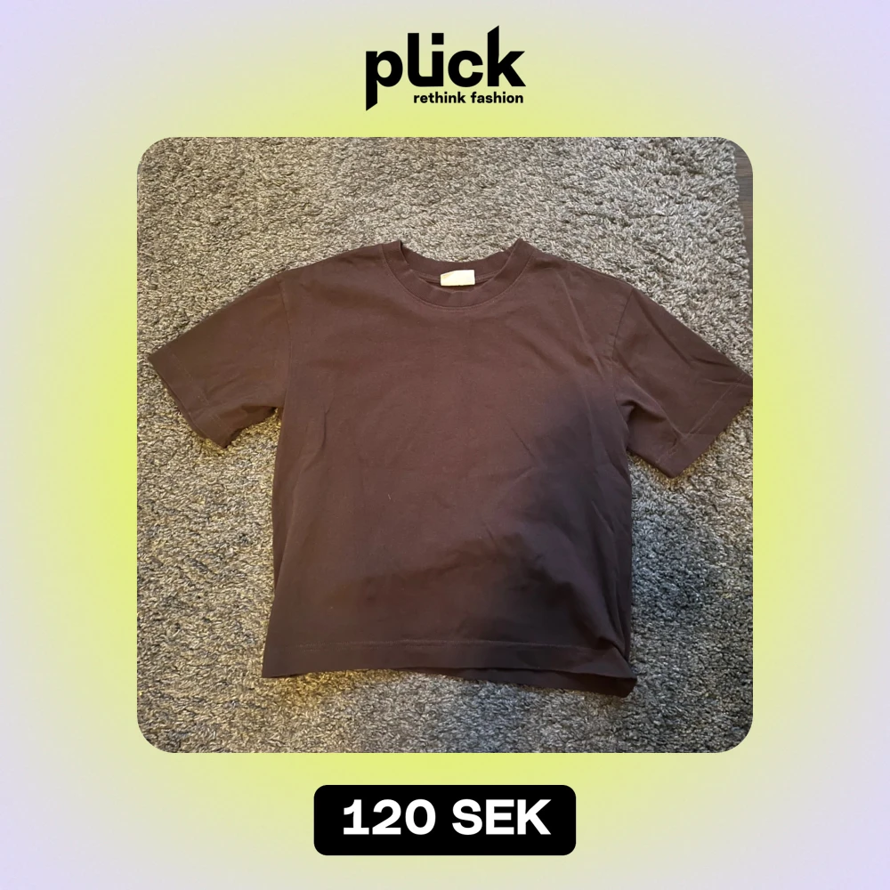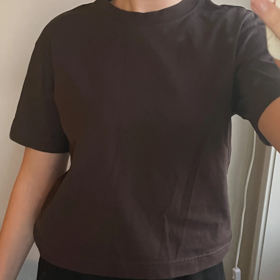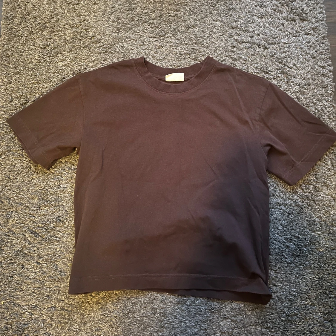 Säljer en enkel och stilren brun t-shirt i bomull. Den har en normal passform och korta ärmar, perfekt för vardagsbruk. Den är i en liten kortare modell. Storlek S, använd nån enstaka gång. Passar till allt och är superbekväm!