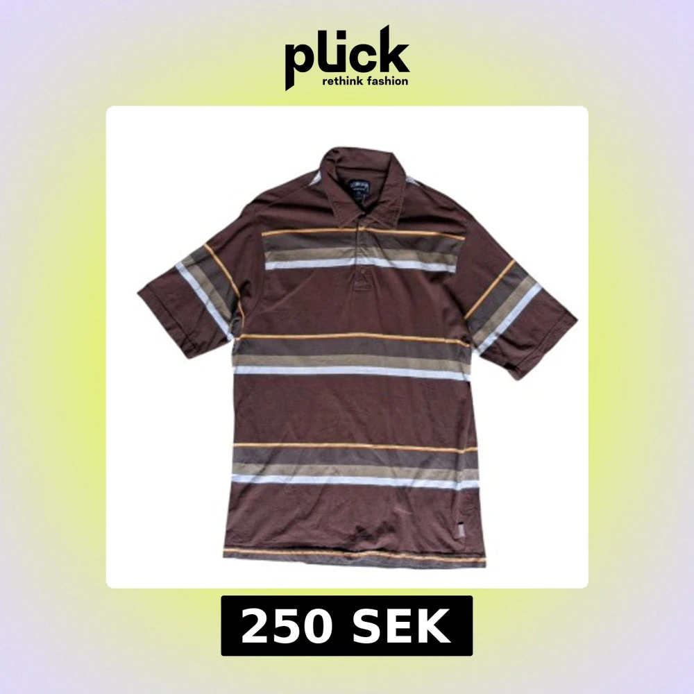 Säljer en brun pikétröja från Stussy med coola ränder i beige, vit och gul. Tröjan är tillverkad i 100% bomull och har korta ärmar. Perfekt för en avslappnad stil! Tröjan har storlek L men passar som lite större