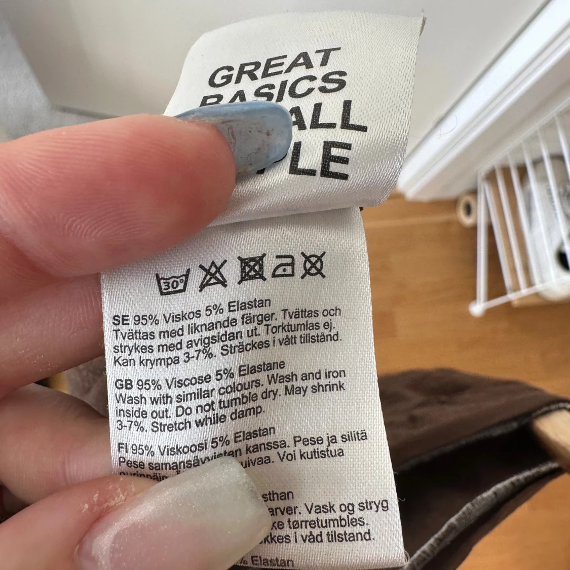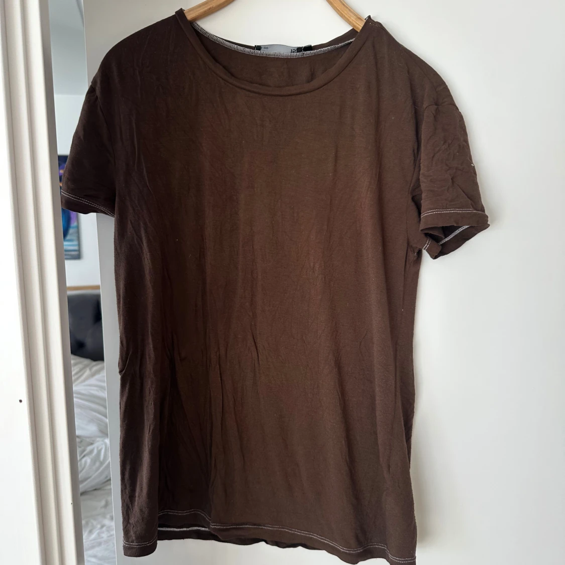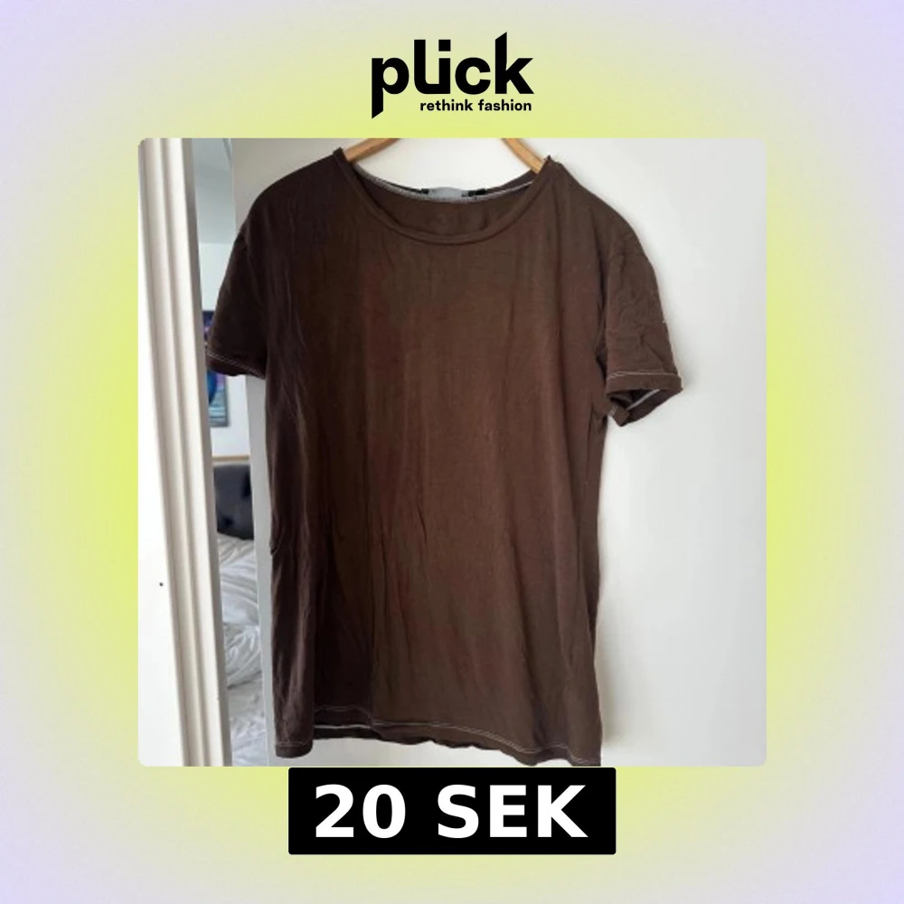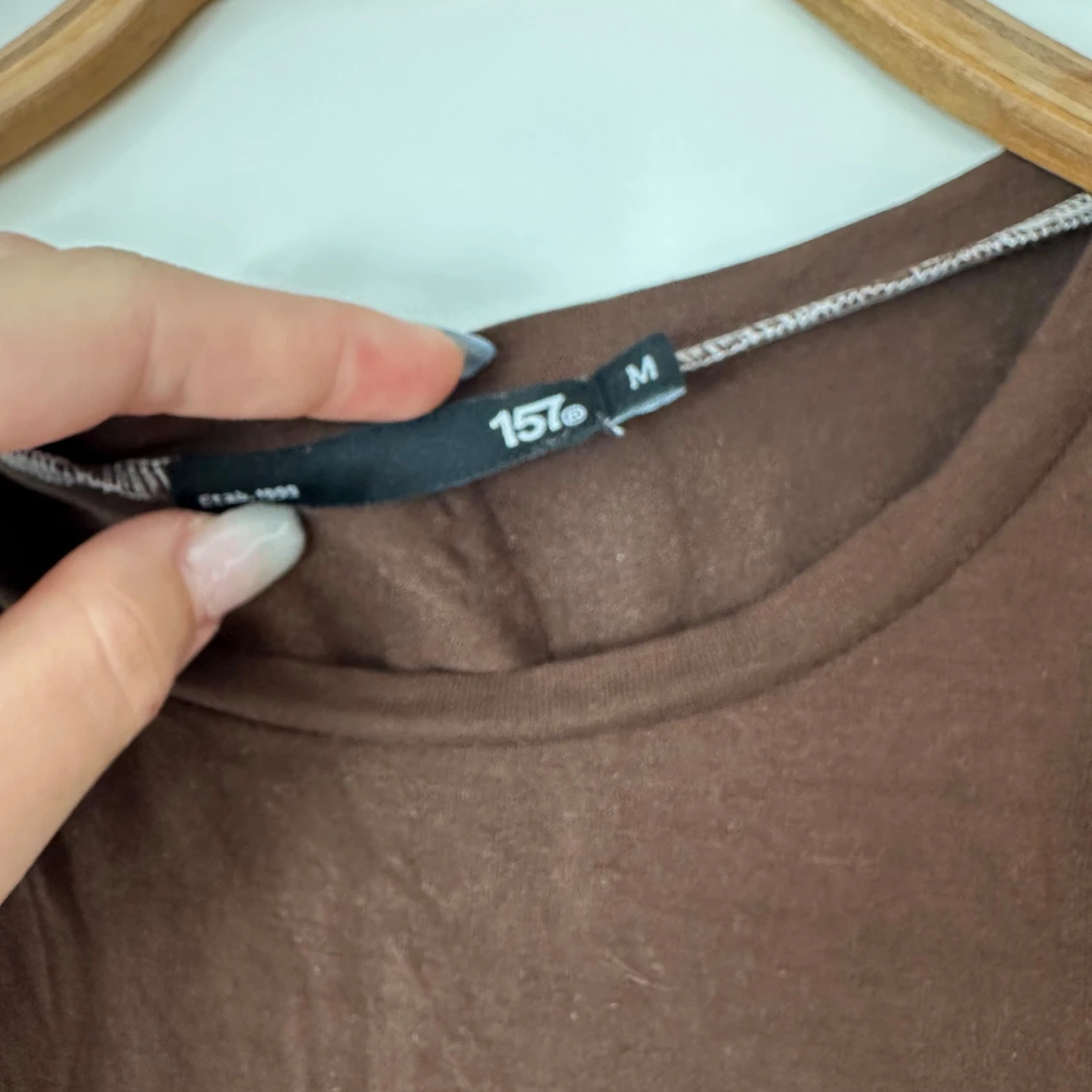 En basic brun t-shirt från 157 i storlek M. T-shirten har rund halsringning, korta ärmar och är tillverkad i mjuk viskosmix med lite stretch för skön passform. Perfekt till jeans eller shorts för en chill look. Finns ett litet hål på ena skulderbladet se bild