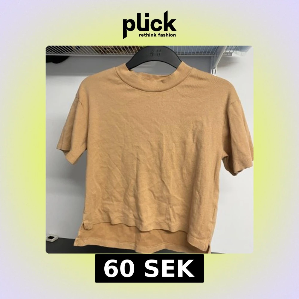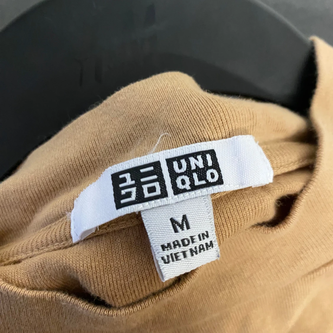 Säljer en beige t-shirt från Uniqlo. Den har en klassisk rund hals och korta ärmar, perfekt för en avslappnad look. Tillverkad i ett mjukt och bekvämt material.