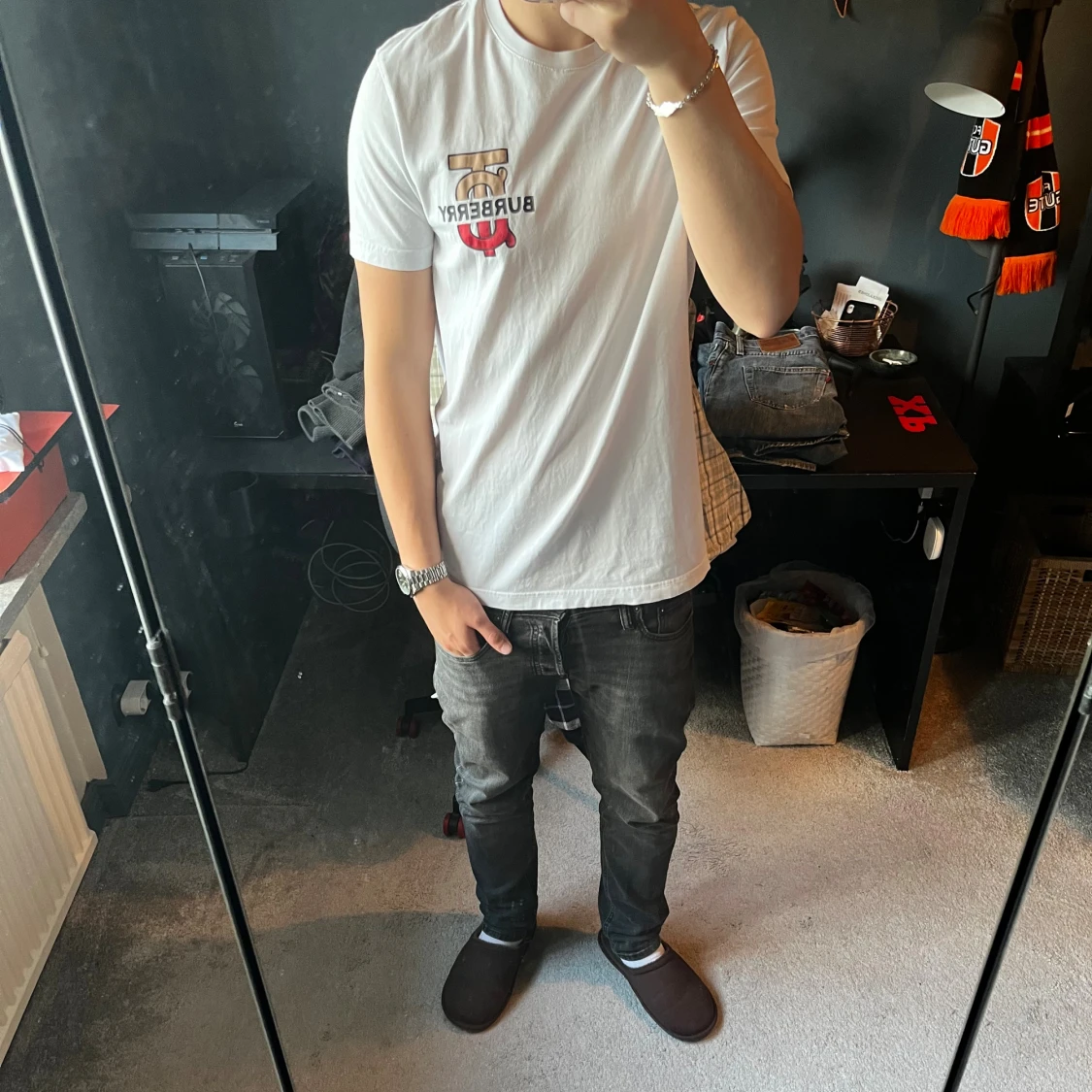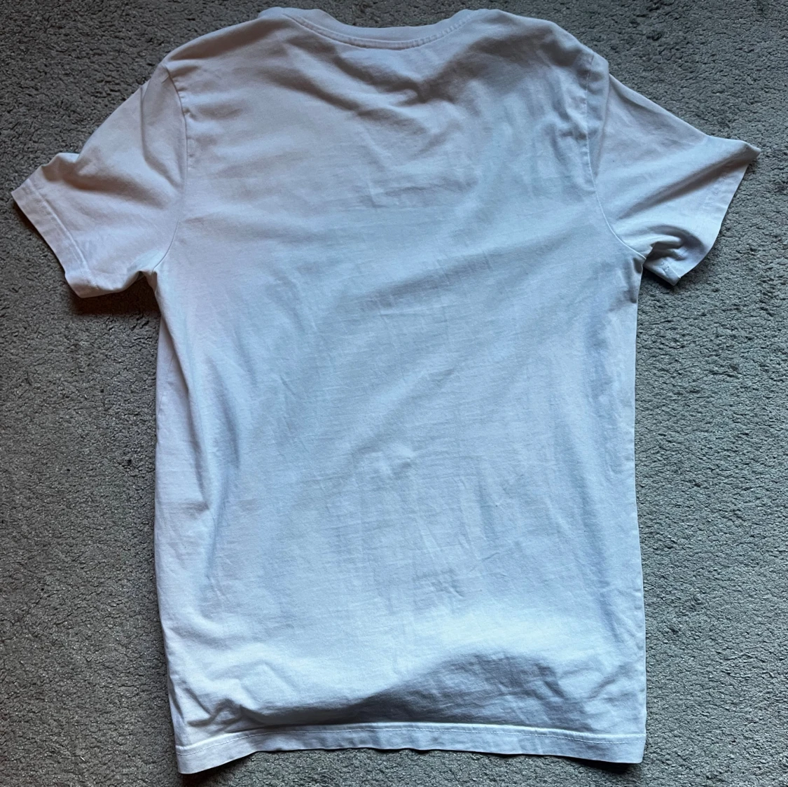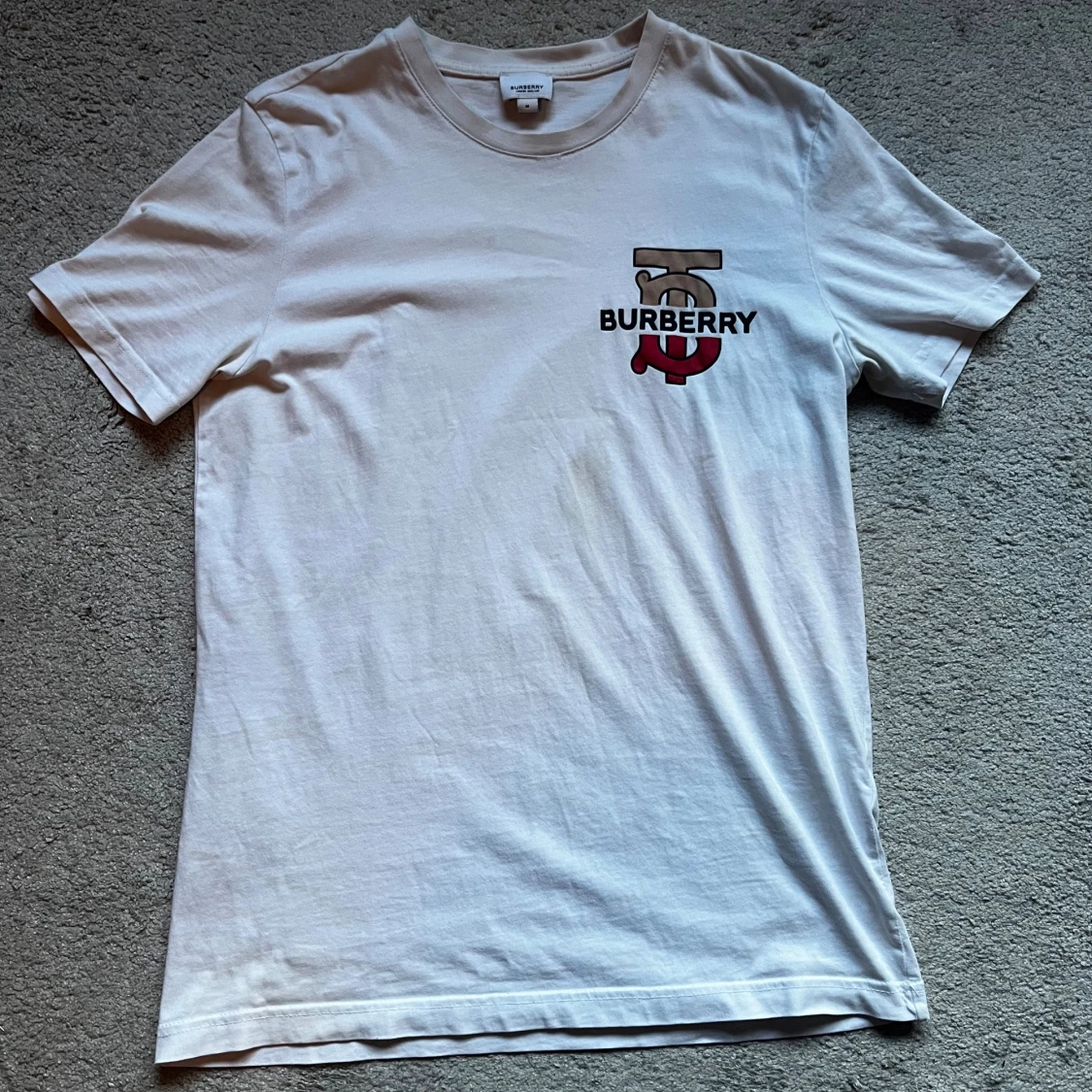 Vit t-shirt från Burberry i mjuk bomull med klassisk rund hals och korta ärmar. På bröstet finns en snygg Burberry-logga i svart, beige och rött. Enkel och stilren design som passar perfekt till jeans eller shorts. Skriv för fler bilder. Pris kan diskuteras vid snabb affär