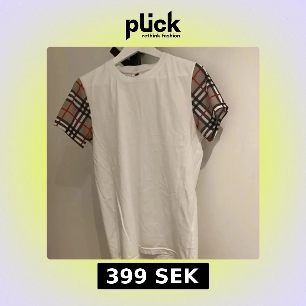 Säljer en snygg vit t-shirt från Burberry i storlek S. T-shirten har klassiska rutiga korta ärmar i beige, svart och rött, vilket ger en unik och trendig look. Materialet är mjuk bomull och passformen är normal. Perfekt för dig som gillar designerplagg med coola detaljer.