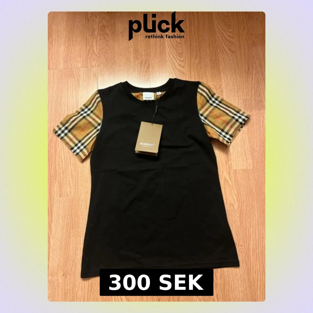 Svart t-shirt från Burberry i storlek M men passar s/xs med klassiska rutiga korta ärmar i beige, svart, vit och röd. Snygg kontrast mellan den helsvarta kroppen och de ikoniska Burberry-rutorna på ärmarna. Rund hals och mjukt bomullsmaterial.