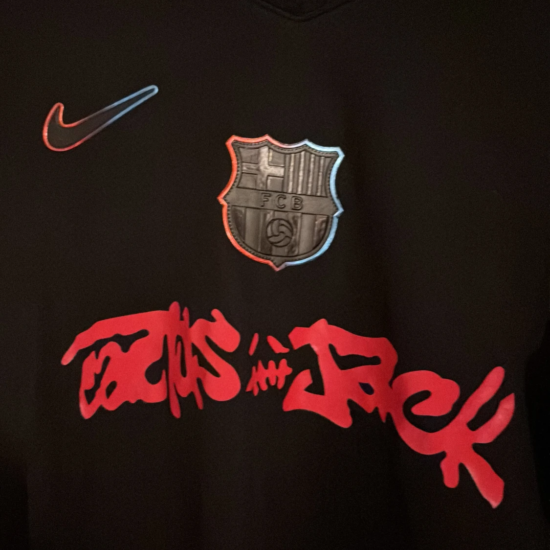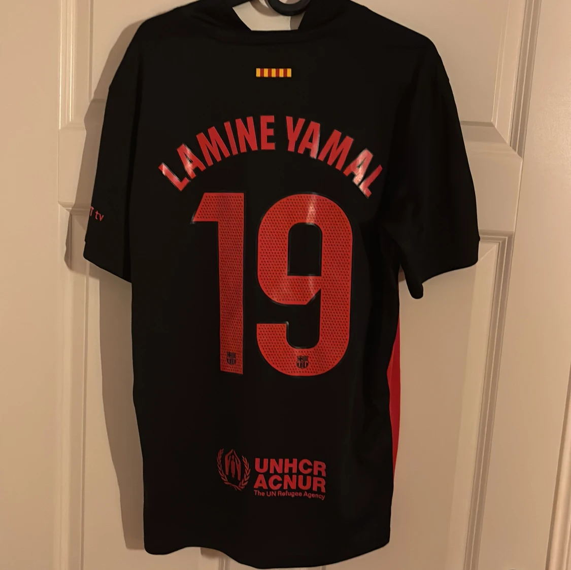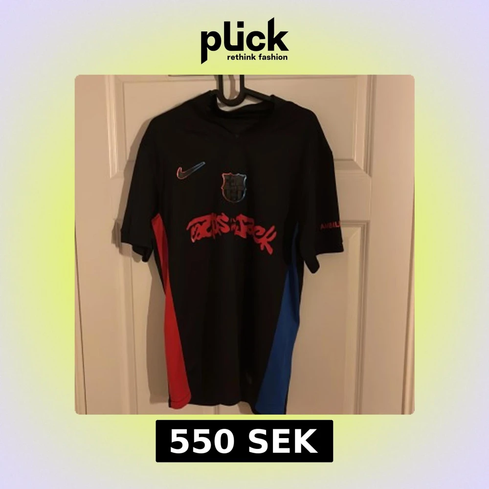 Säljer en svart FC Barcelona x Cactus Jack fotbollströja från Nike med röd och blå detalj på sidorna. Tryck med Cactus Jack-logga på bröstet, FCB-emblem och Nike swoosh. På ryggen står Lamine Yamal och nummer 19. Använd fåtal gånger, nyskick