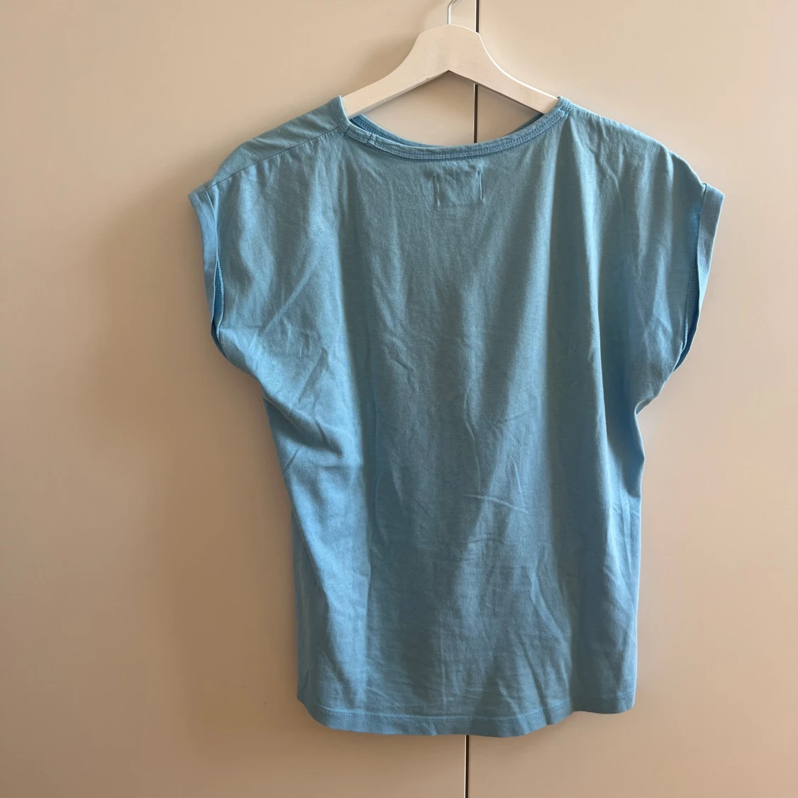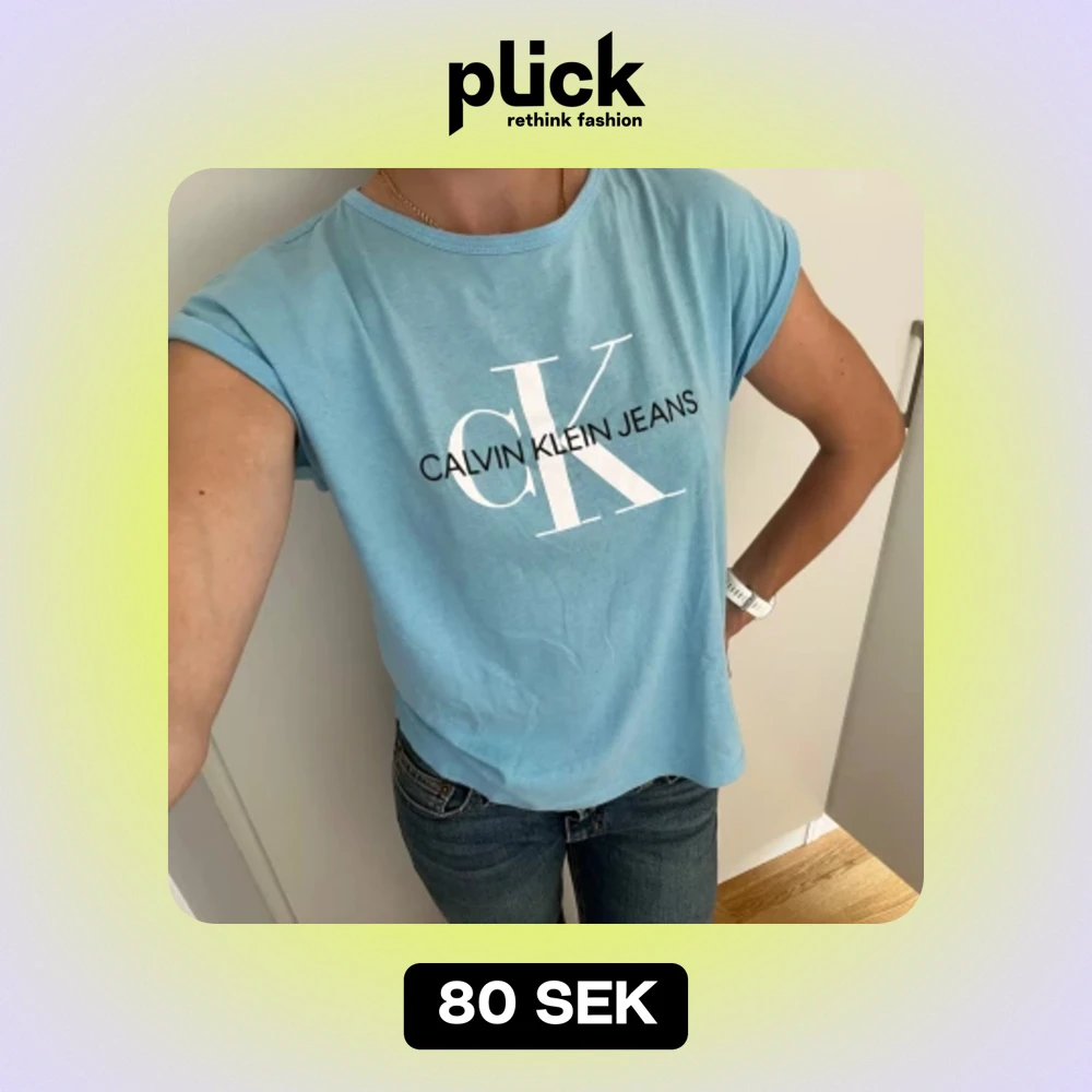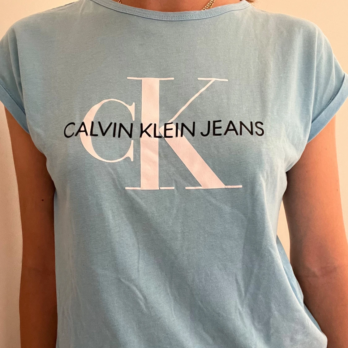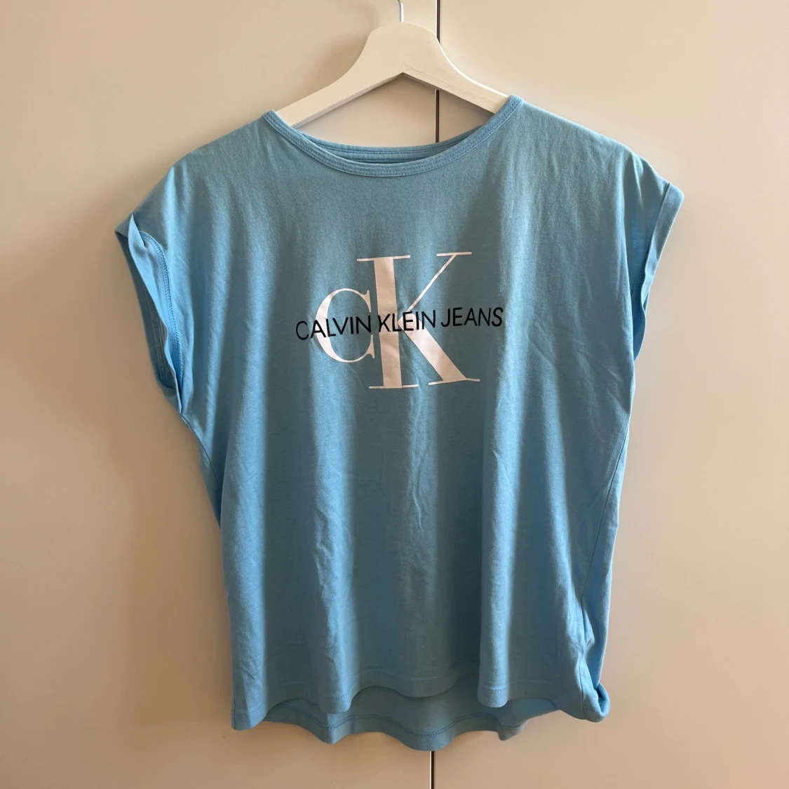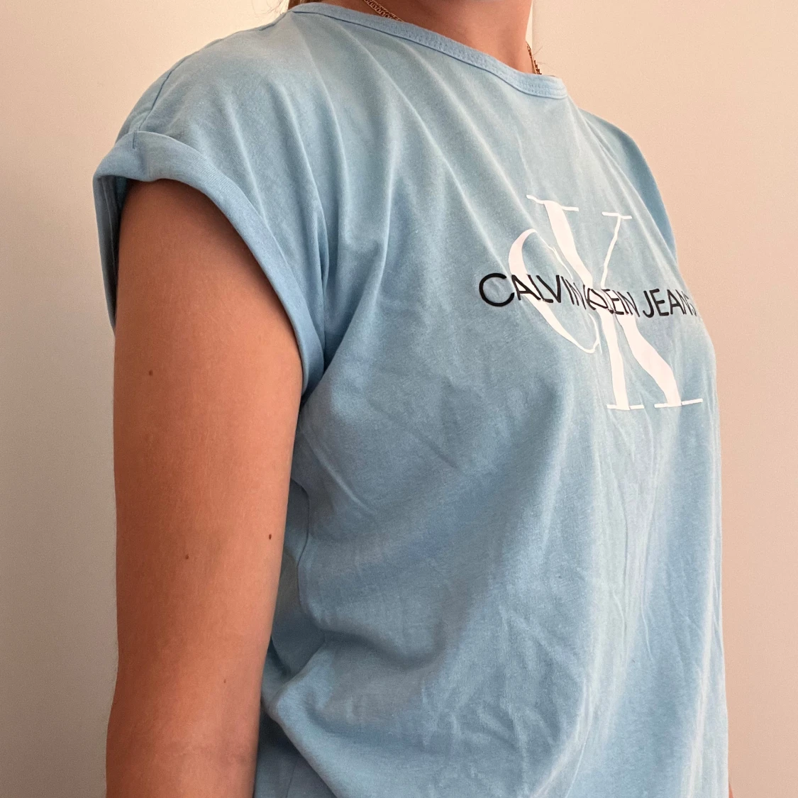 Ljusblå lös T-shirt i storlek 16 år/ S. T-shirten har vikta ärmar och Calvin Klein Jeans tryck på bröstet