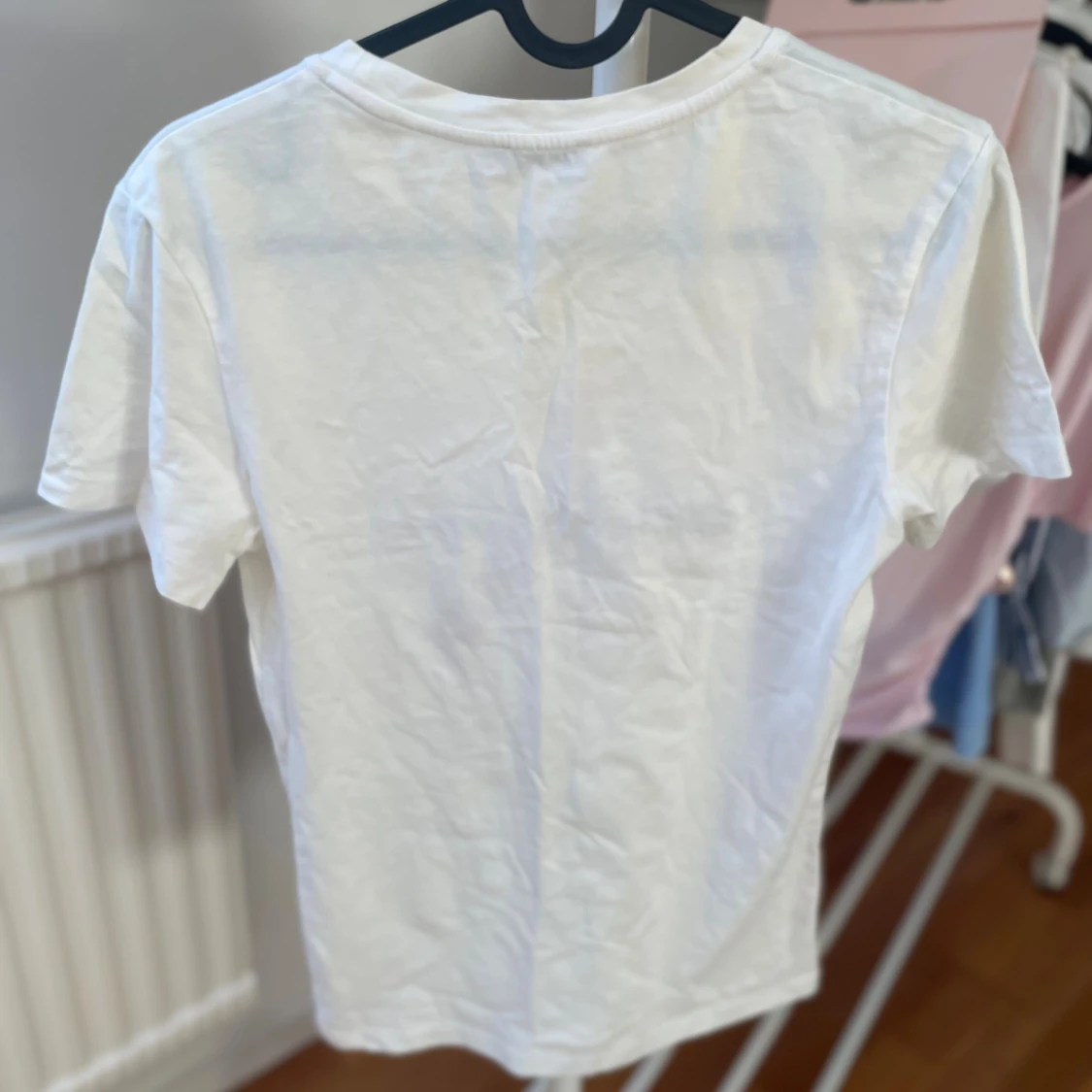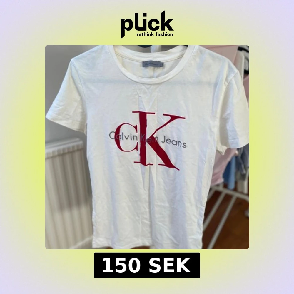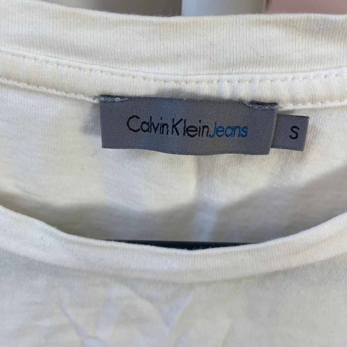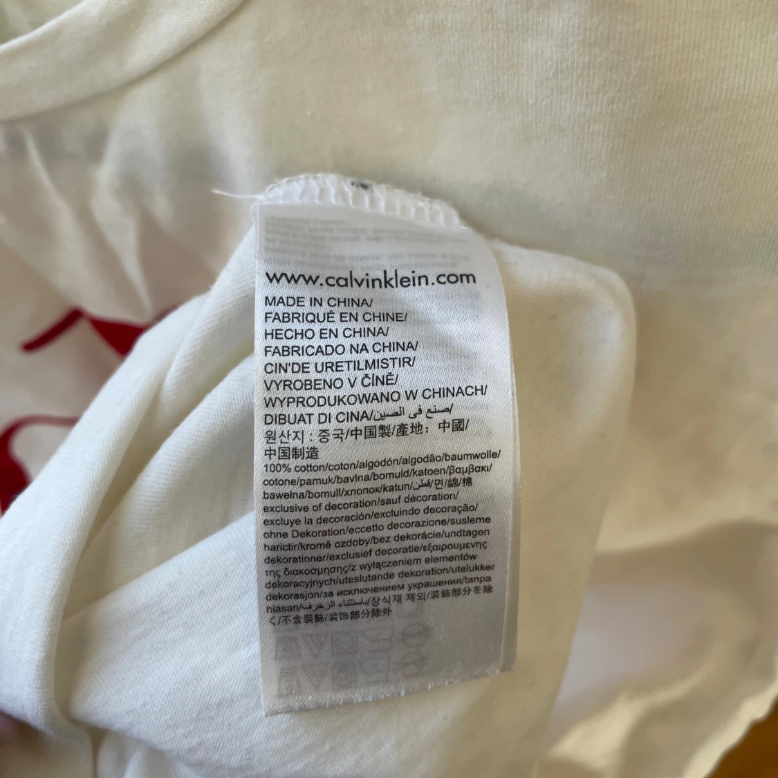 Vit t-shirt från Calvin Klein i 100% bomull med stor röd CK-logga och grå text på bröstet. Klassisk rund halsringning och korta ärmar.