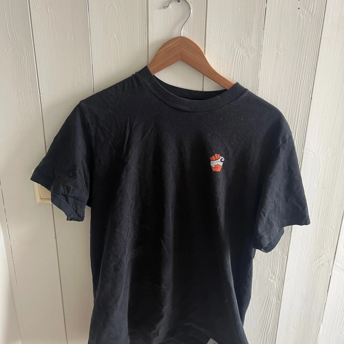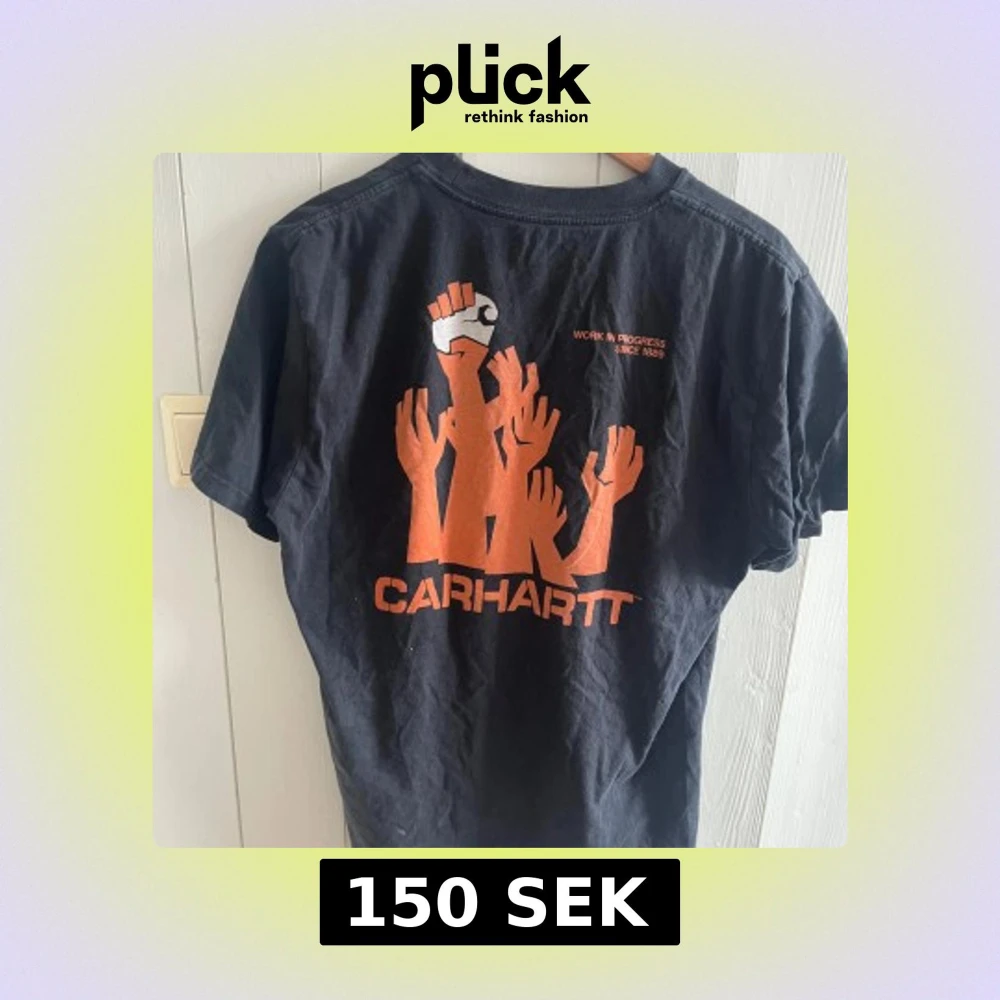 Säljer en svart t-shirt från Carhartt med ett coolt tryck av uppsträckta händer i orange på baksidan och en liten knuten näve på framsidan. Perfekt för en avslappnad stil.