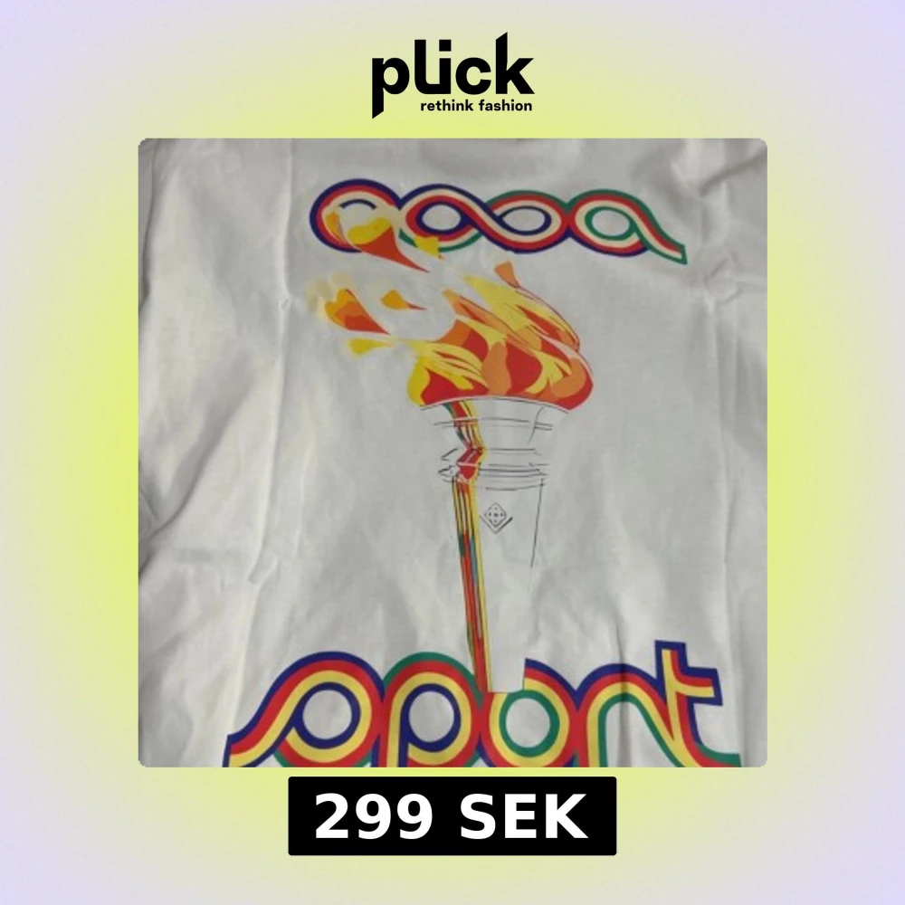 Vit t-shirt från Casablanca Sport med färgglad tryckt fackla och logga i rött, blått, grönt och gult på bröstet. Klassisk passform och rund hals. Perfekt statement-plagg för dig som gillar sportig och retro stil. Oanvänd