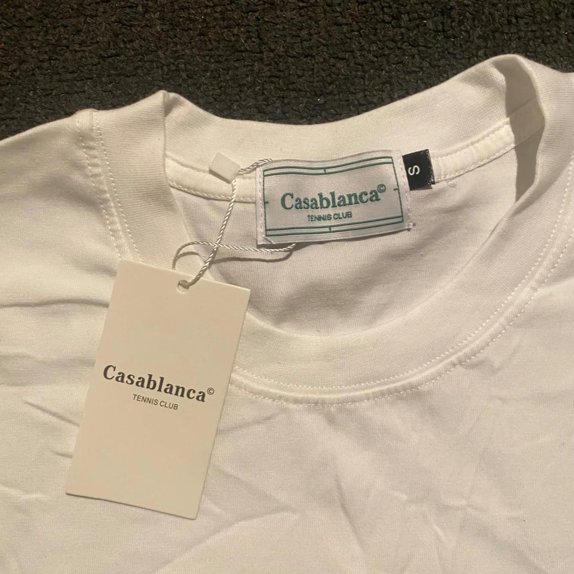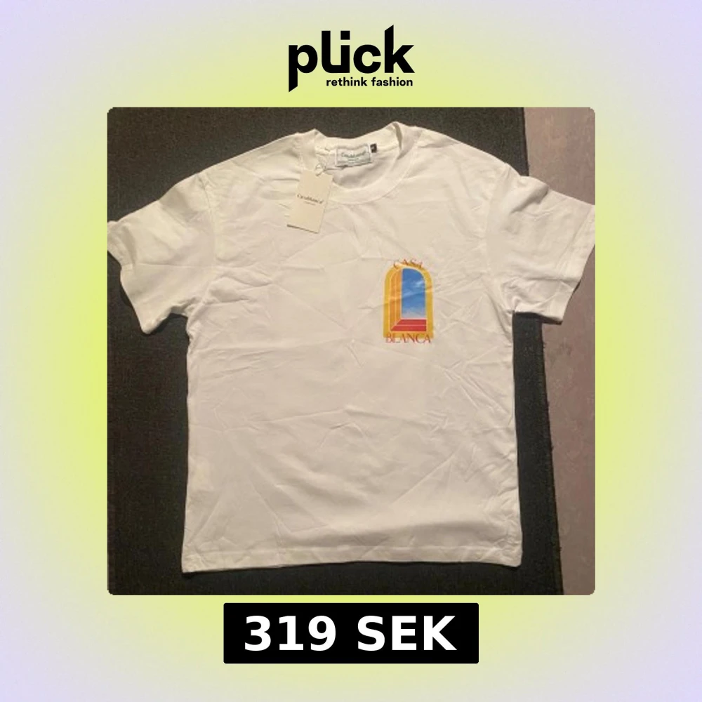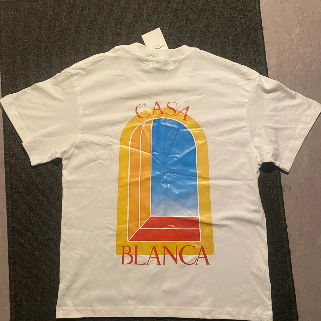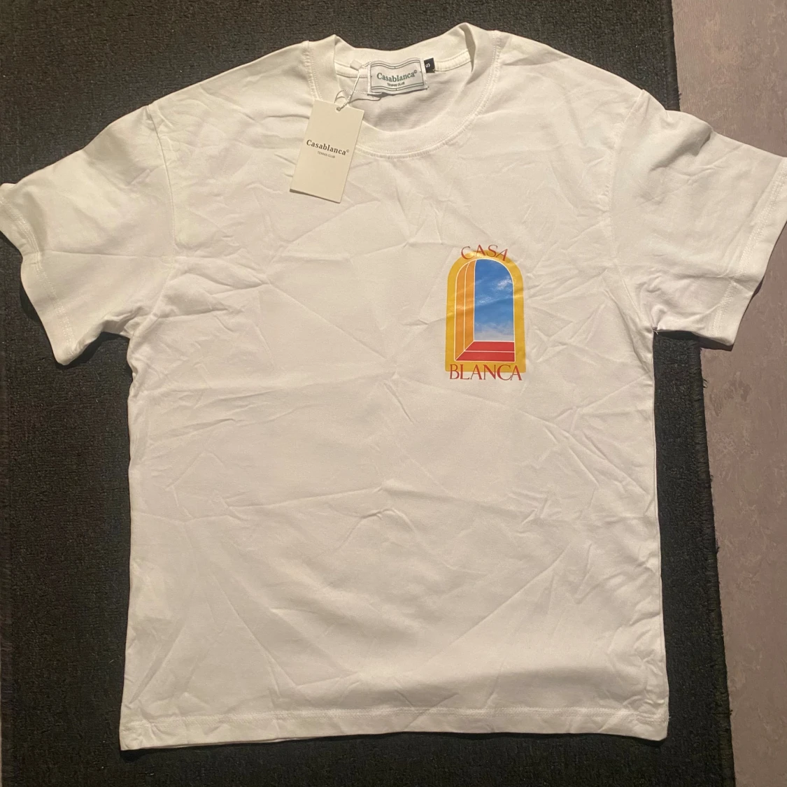 Vit t-shirt från Casablanca med färgglad grafisk print i gult, blått och rött både fram och bak. Klassisk passform, rund hals och korta ärmar. Tillverkad i mjuk bomull och har en stilren vibe med tydlig logga och konstnärlig design.