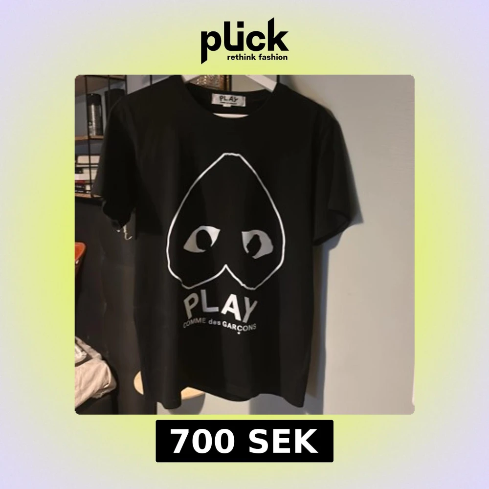 Svart t-shirt från Comme des Garçons Play med stort vitt tryck framtill som visar det ikoniska hjärtat med ögon och texten PLAY. Klassisk rund hals och korta ärmar. Materialet är mjuk bomull som känns skön mot huden.