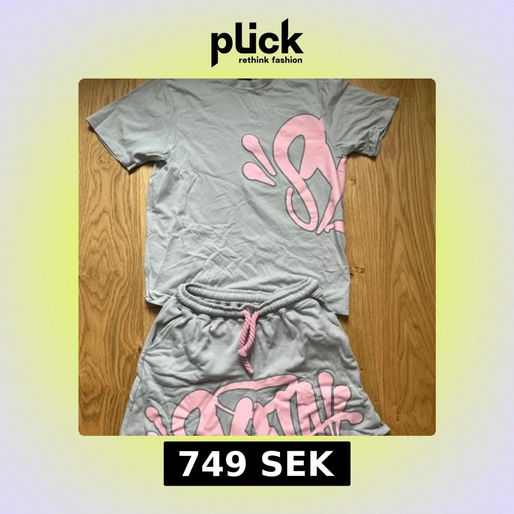 Syna world tracksuit, tröja + shorts. Snygga grå shorts med stort rosa grafiskt tryck framtill och matchande rosa snörning i midjan. Mjukt material och avslappnad passform, perfekta för sommardagar eller chill hemma. Elastisk midja för extra komfort och cool streetkänsla.