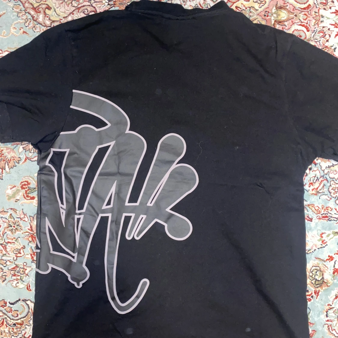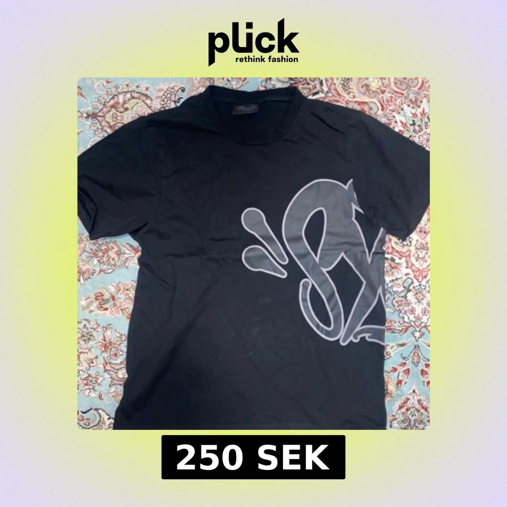 Snygg svart t-shirt med ett stort, stilrent Synaworld teyck i grått som täcker både fram- och baksidan. Perfekt för en casual look.