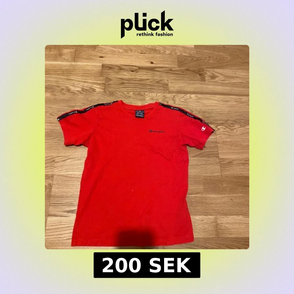 Röd t-shirt från Champion med svarta och vita loggband längs axlarna. Klassisk passform och rund halsringning. Liten broderad Champion-logga på bröstet och ärmen. Perfekt för en sportig och avslappnad stil.
