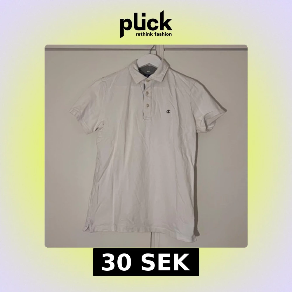 Vit pikétröja från Champion i klassisk modell krage, knappar fram och ett grått C på framsidan.