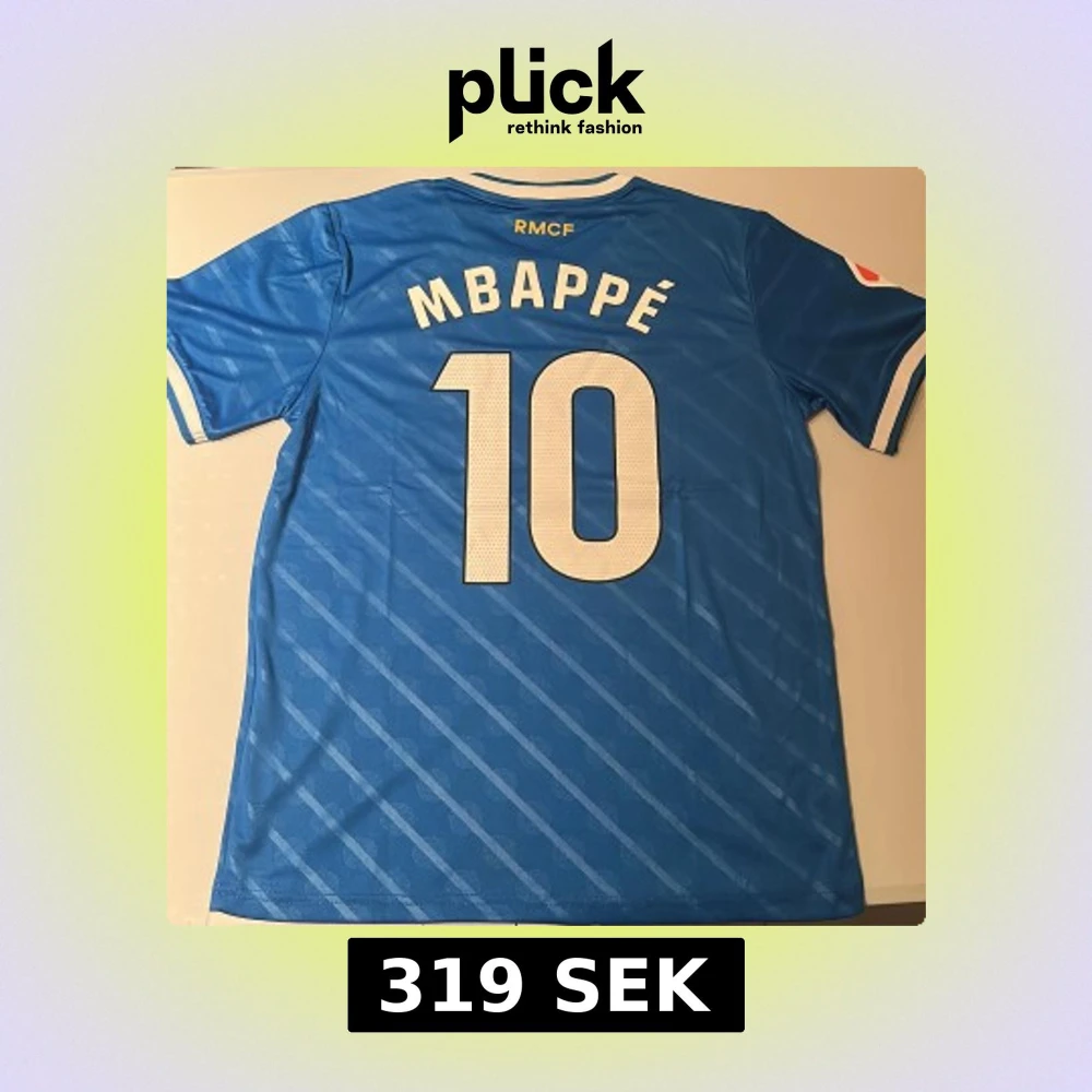 Snygg blå Real Madrid fotbollströja med Mbappé och nummer 10 på ryggen. Tröjan har vita detaljer, klubbmärke, Adidas-logga och sponsortryck framtill. Tillverkad i lätt och ventilerande material med diskret randigt mönster och klassisk rund hals. Replika, endast handtvätt gäller!