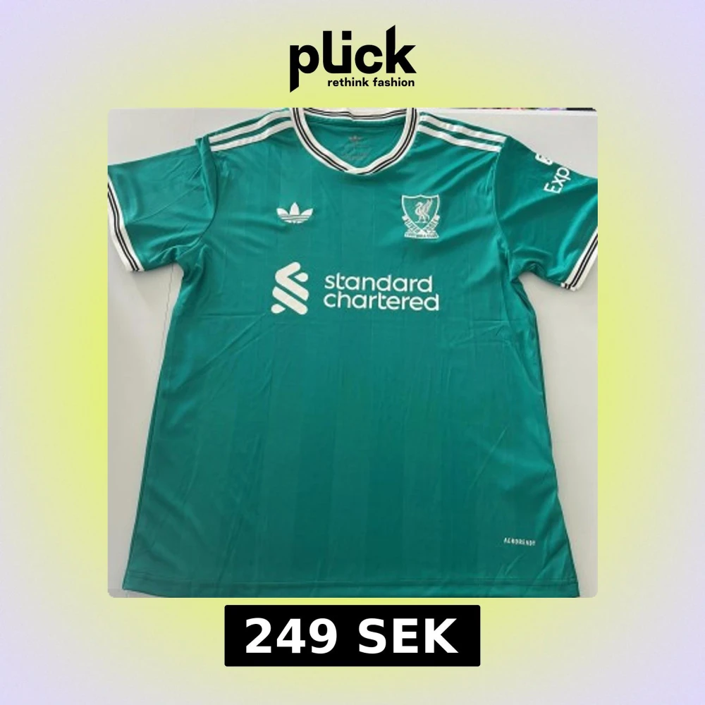 Snygg grön Liverpool fotbollströja från Adidas med vita detaljer och klubbmärke på bröstet. Tröjan har klassiska Adidas-ränder på axlarna, vit logga och sponsortryck framtill. Tillverkad i lätt och ventilerande polyester med korta ärmar och ribbade muddar. Replika, endast handtvätt gäller!