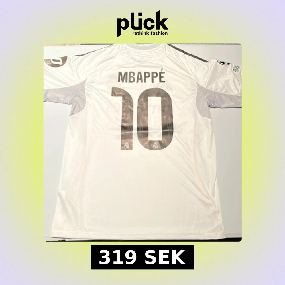 Säljer en officiell Real Madrid fotbollströja från Adidas med Mbappé och nummer 10 på ryggen. Tröjan är vit med svarta detaljer, guldiga inslag och klubbmärke på bröstet. Champions League-märke på ärmen och 'Emirates Fly Better' tryck på framsidan. Materialet är lätt och andas. Replika, endast handtvätt gäller!