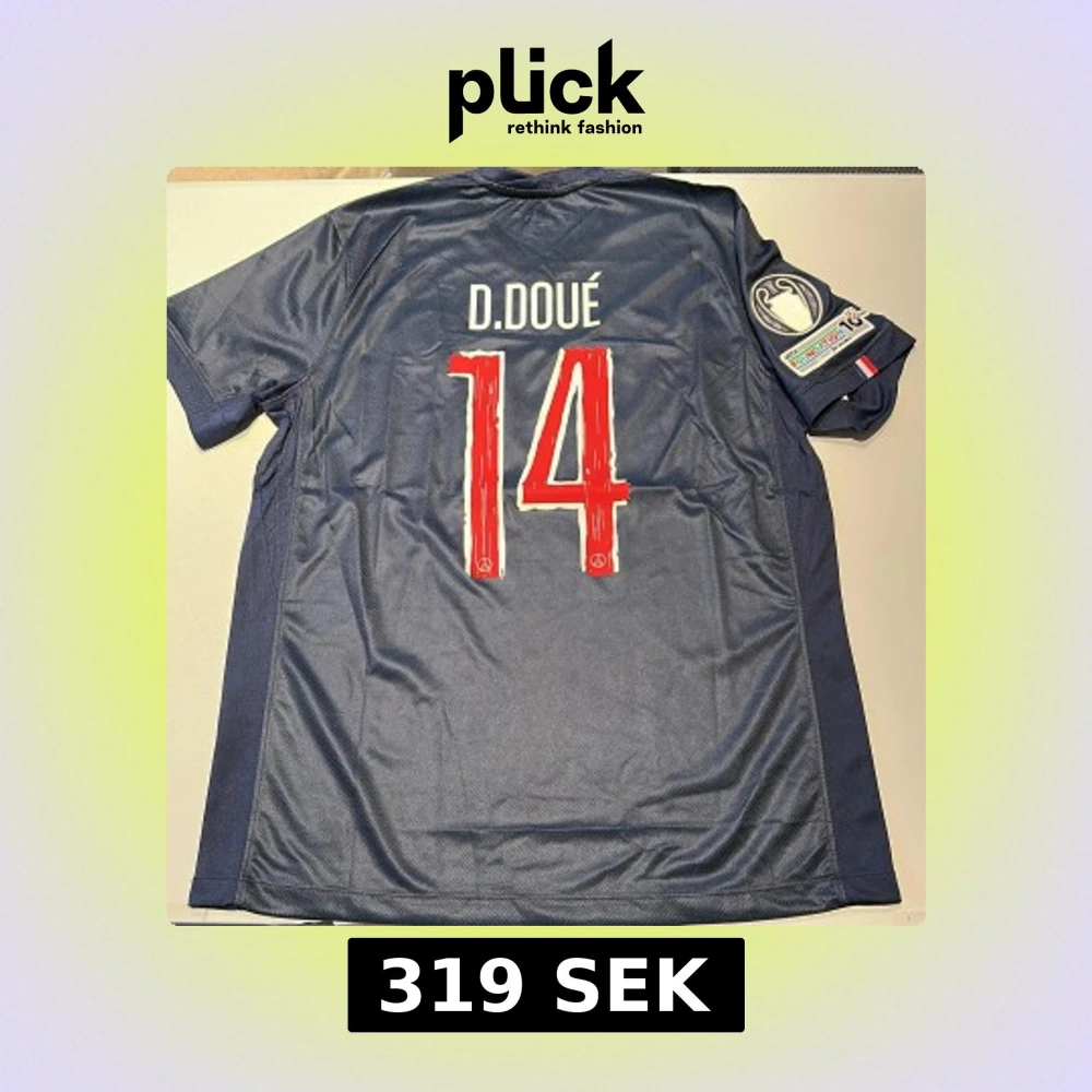 Paris Saint-Germain fotbollströja med D. Doué och nummer 14 på ryggen. Mörkblå med röd och vit detalj framtill, officiella UEFA Champions League och Foundation-märken på ärmen. Tillverkad i lätt och ventilerande polyester, klassisk passform. Replika, endast handtvätt gäller!