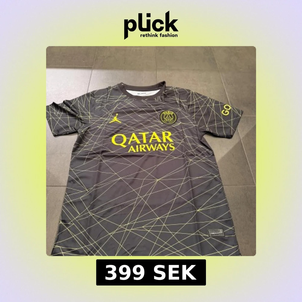 Säljer en svart PSG fotbollströja med gula detaljer och tryck från Jordan och Qatar Airways. Tröjan har korta ärmar, geometriskt mönster i gult och Paris Saint-Germain-logga på bröstet. Perfekt för fotbollsfans som vill sticka ut på planen.