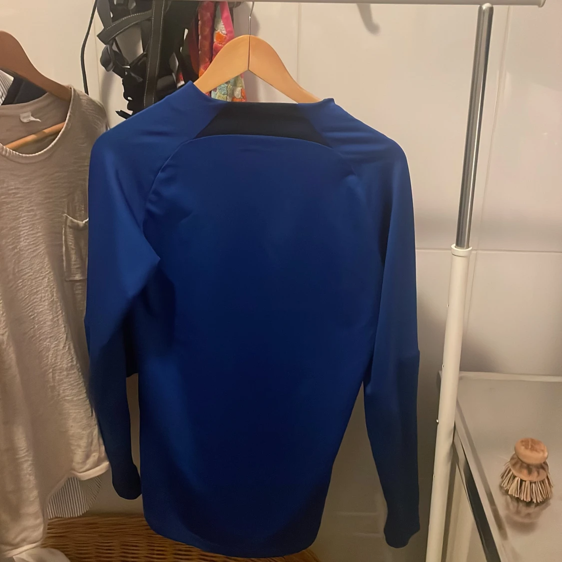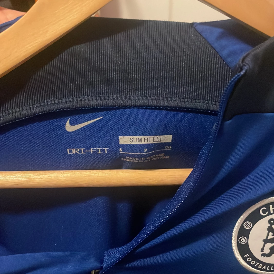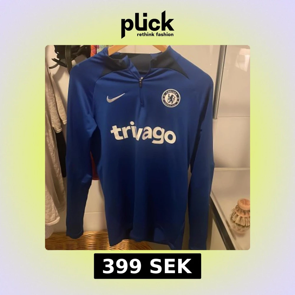 Chelsea FC långärmad träningströja från Nike i blått med klubbmärke och Trivago-tryck på bröstet. Slim fit-modell i Dri-FIT-material som andas, halv dragkedja framtill och sportig look. Perfekt för dig som älskar fotboll och vill ha en snygg fotbollströja! Köpt direkt från UNISPORT, fullt äkta!