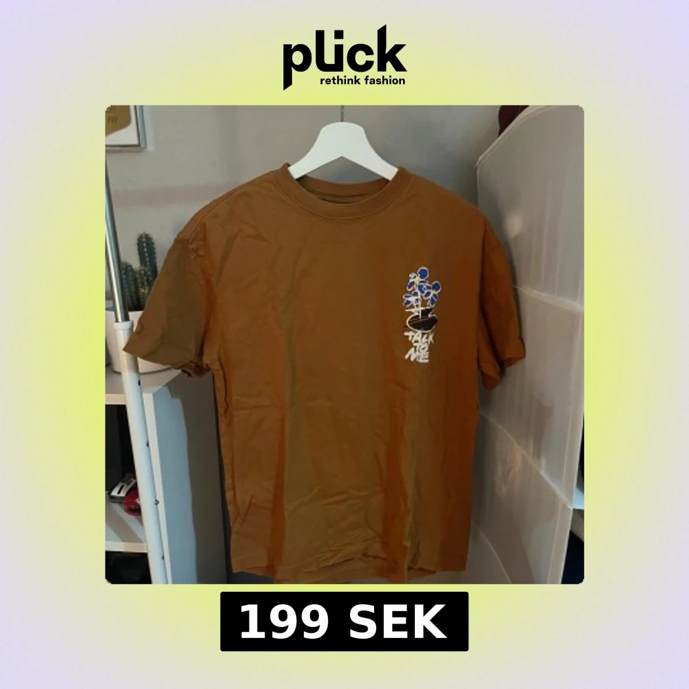 Säljer en brun t-shirt från H&M med relaxed fit. Framsidan har ett litet tryck med blå blommor och texten 'Talk to me', medan baksidan har ett större blommotiv och samma text. Skön bomullskvalitet och korta ärmar, perfekt för en chill stil.