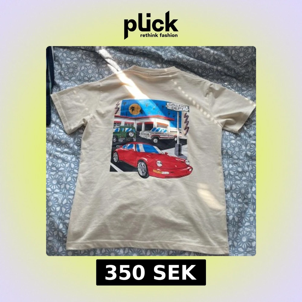 Vit/Cream/Beige/Offwhite t-shirt från Gallery Dept. Med färgglatt tryck på ryggen som visar en röd Porsche och bensinstation. Liten logga och adress på bröstet. Klassisk passform och rund halsringning. Storlek M men passar S. Använd en gång och säljer för att den var för stor.