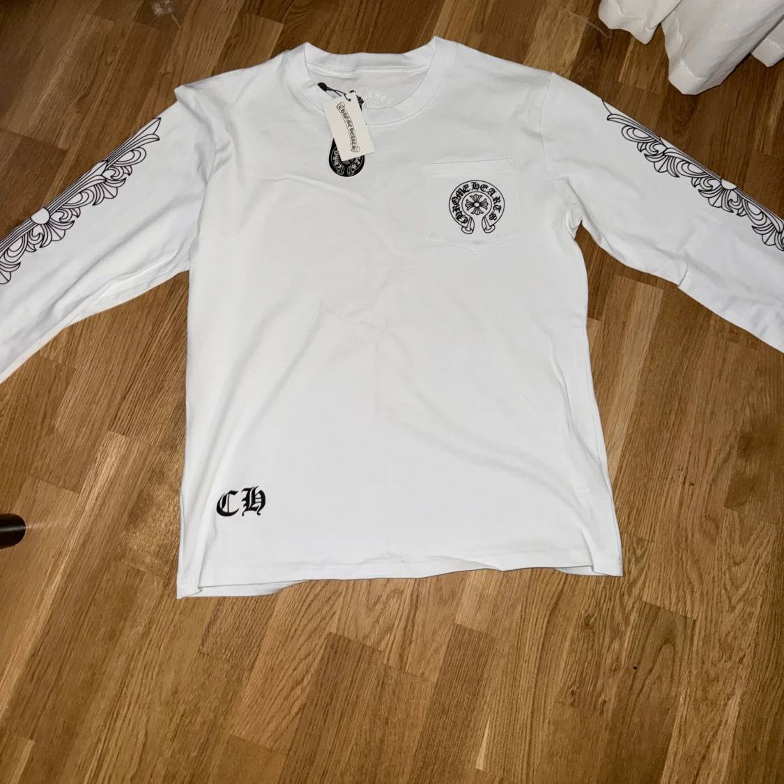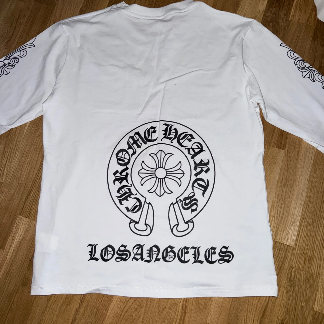 Tja! Säljer en helt ny chrome hearts long sleeve! Snygga detaljer på ärmarna, framsida och baksidan! Köpt på Vestaire collectives! Storlek L - True to size! Org tags följer med:)