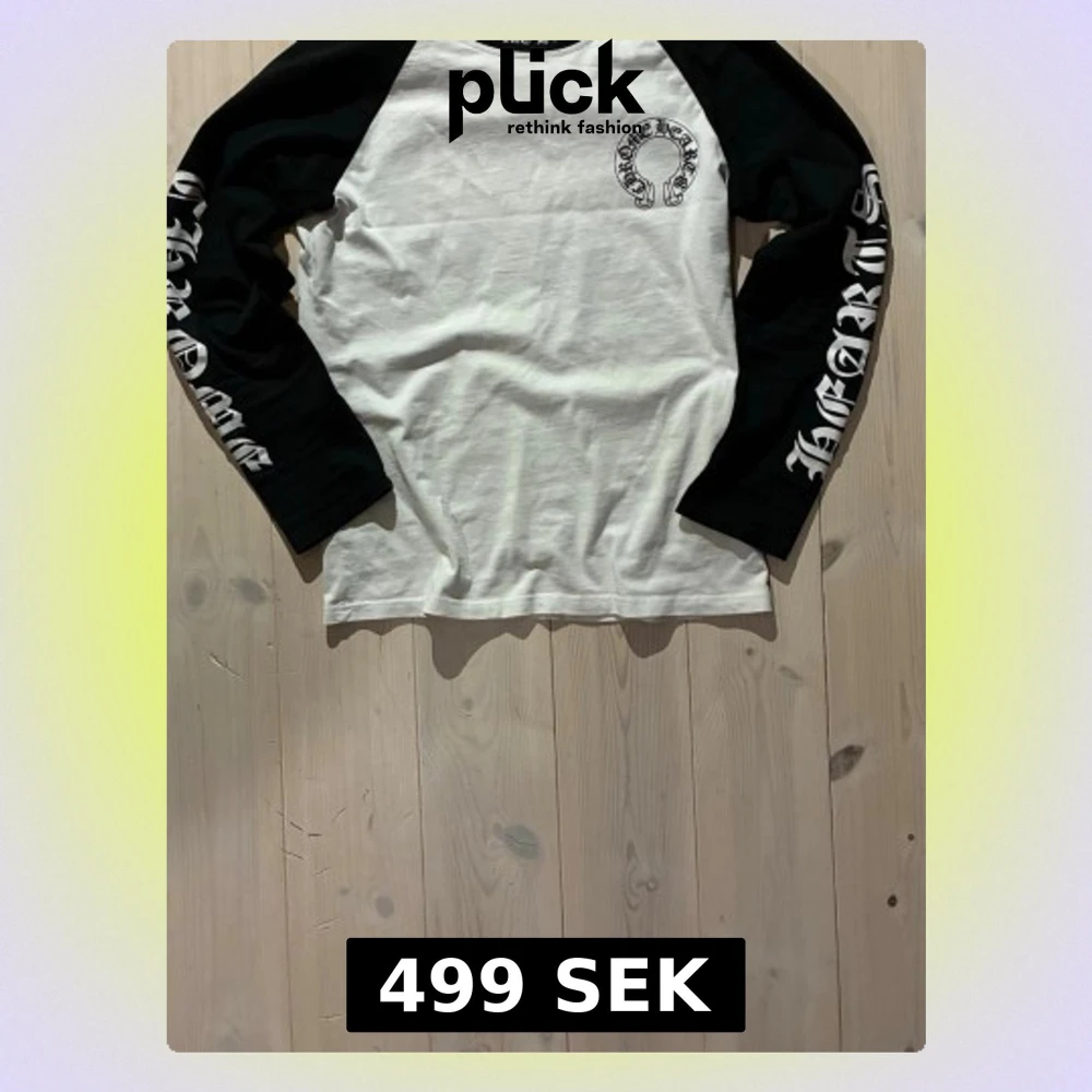 Säljer en svartvit långärmad tröja från Chrome Hearts med raglanärmar och tryck på både ärmar och bröstet. Tröjan har en avslappnad passform och är tillverkad i mjuk bomull. Perfekt för dig som gillar streetwear och snygga detaljer.
