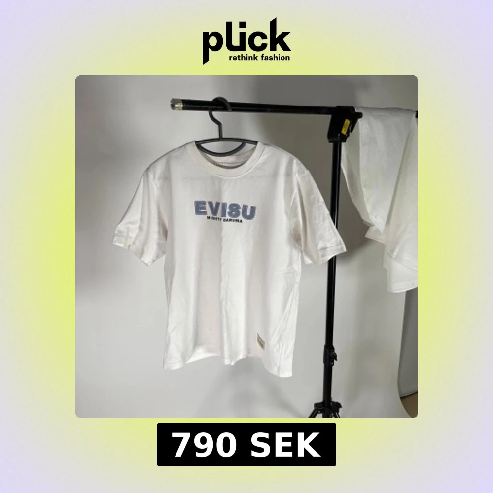 Vit t-shirt från Evisu med blått 'EVISU MIGHTY DARUMA'-tryck på bröstet. Extremt bra kvalité och är i princip i nyskick. Köpt på farfetch finns kvitto. nypris 1190.