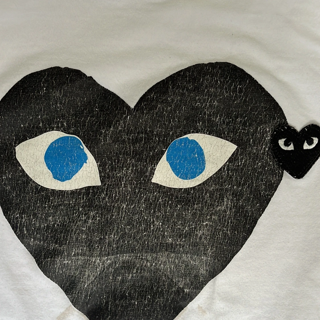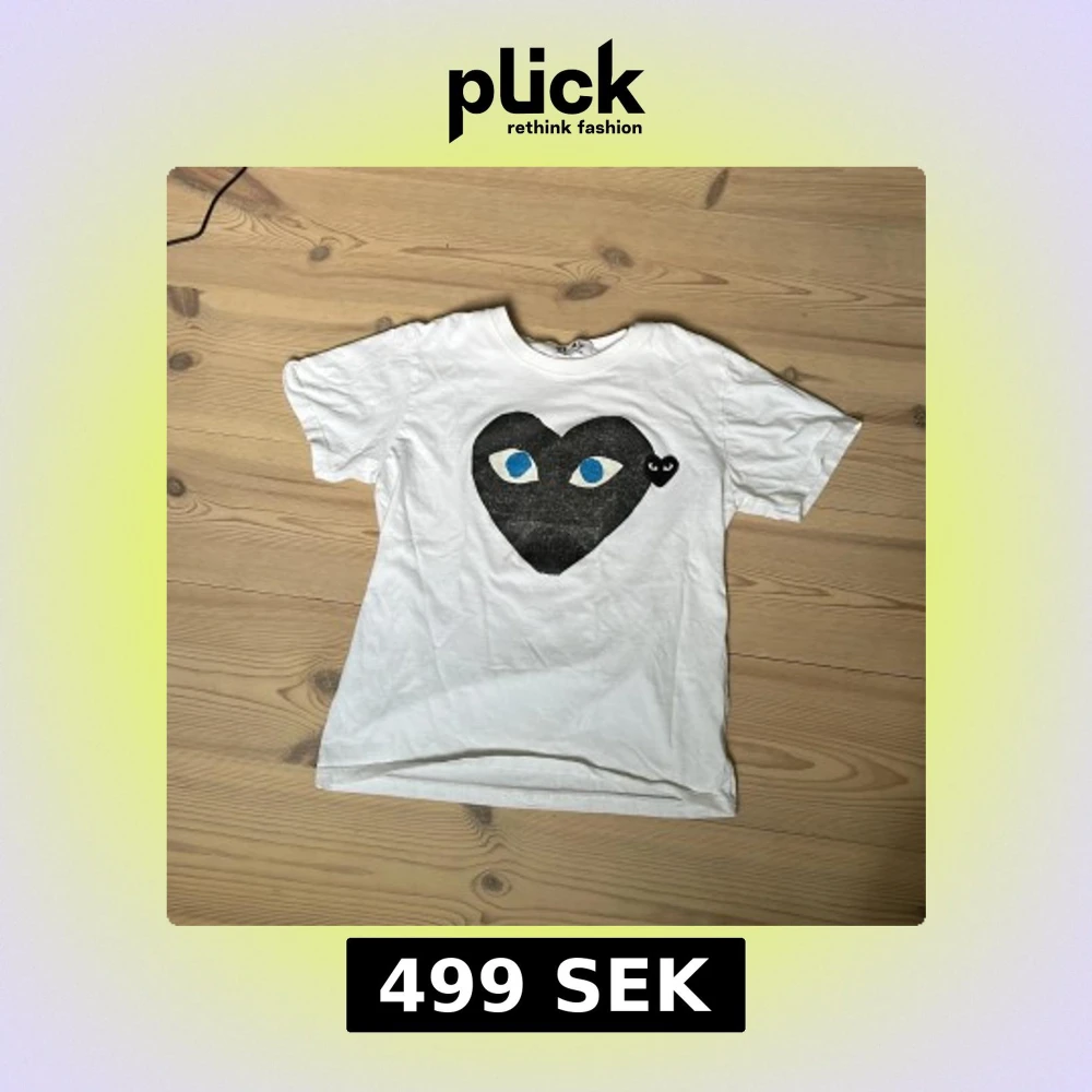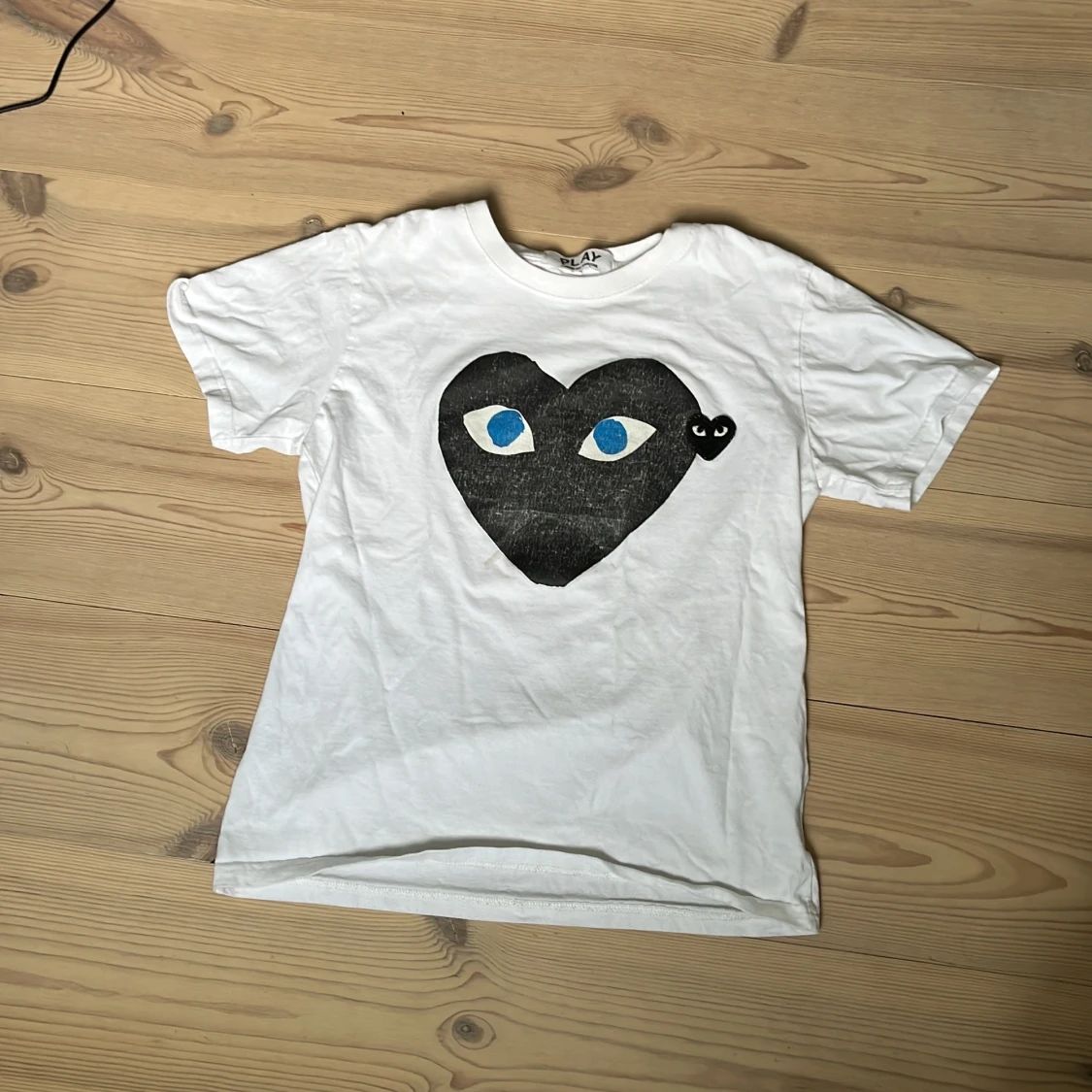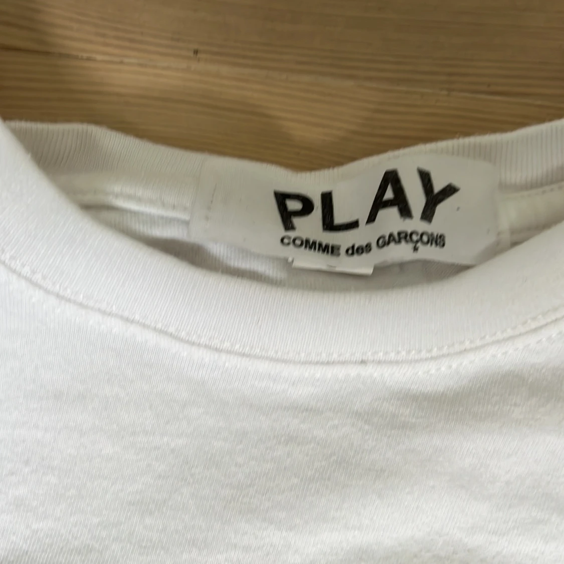 Vit t-shirt från Comme des Garçons Play. Helt okej skick hjärtat har spruckit i färg men inga skador på själva tröjan. Kan gå ner i snabbaffär.