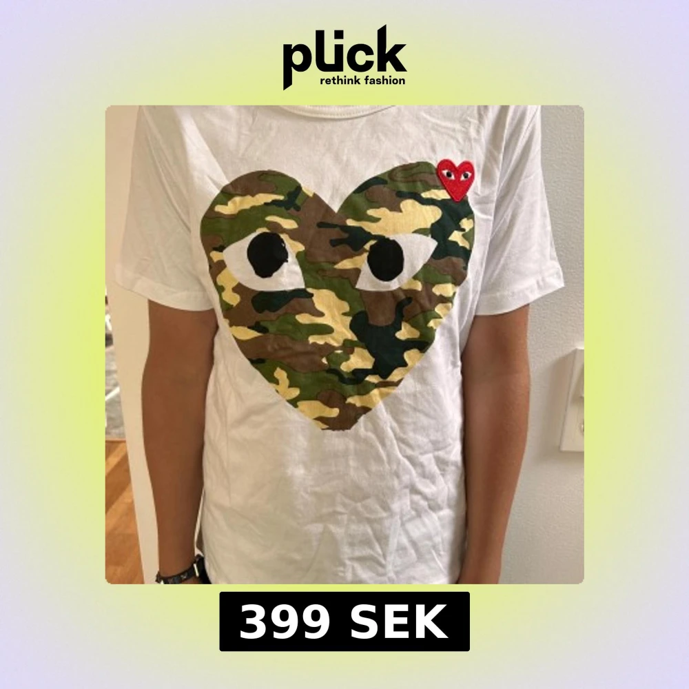 Vit t-shirt från Comme des Garçons Play med stort hjärta i camouflage-mönster och ögon på bröstet. Liten röd hjärtpatch med ögon uppe till höger. Klassisk rund hals och korta ärmar. Skön bomullskvalitet och snygg streetstil.