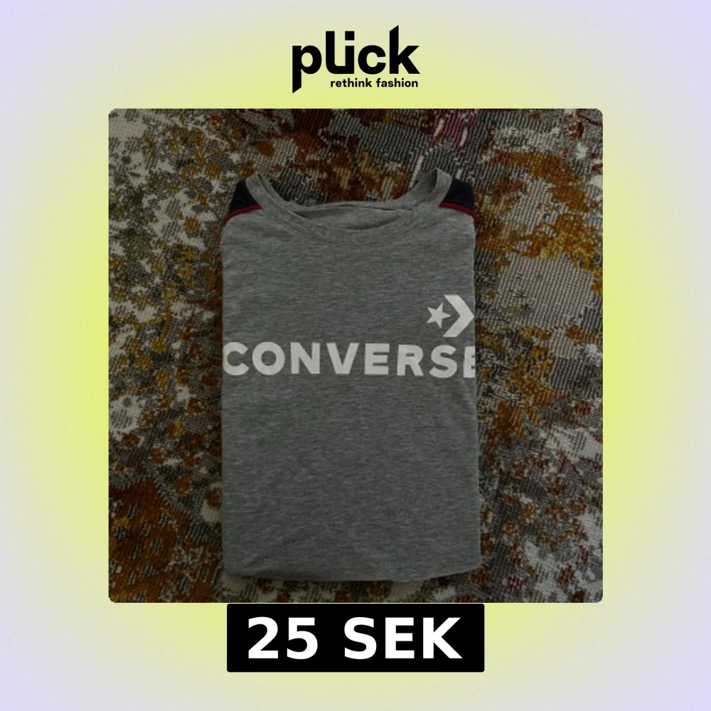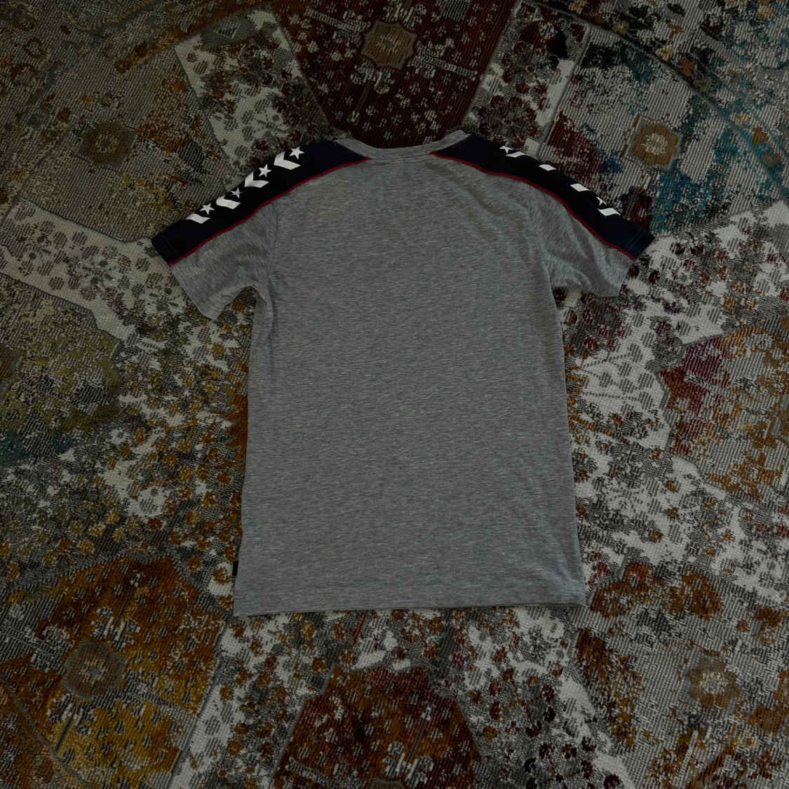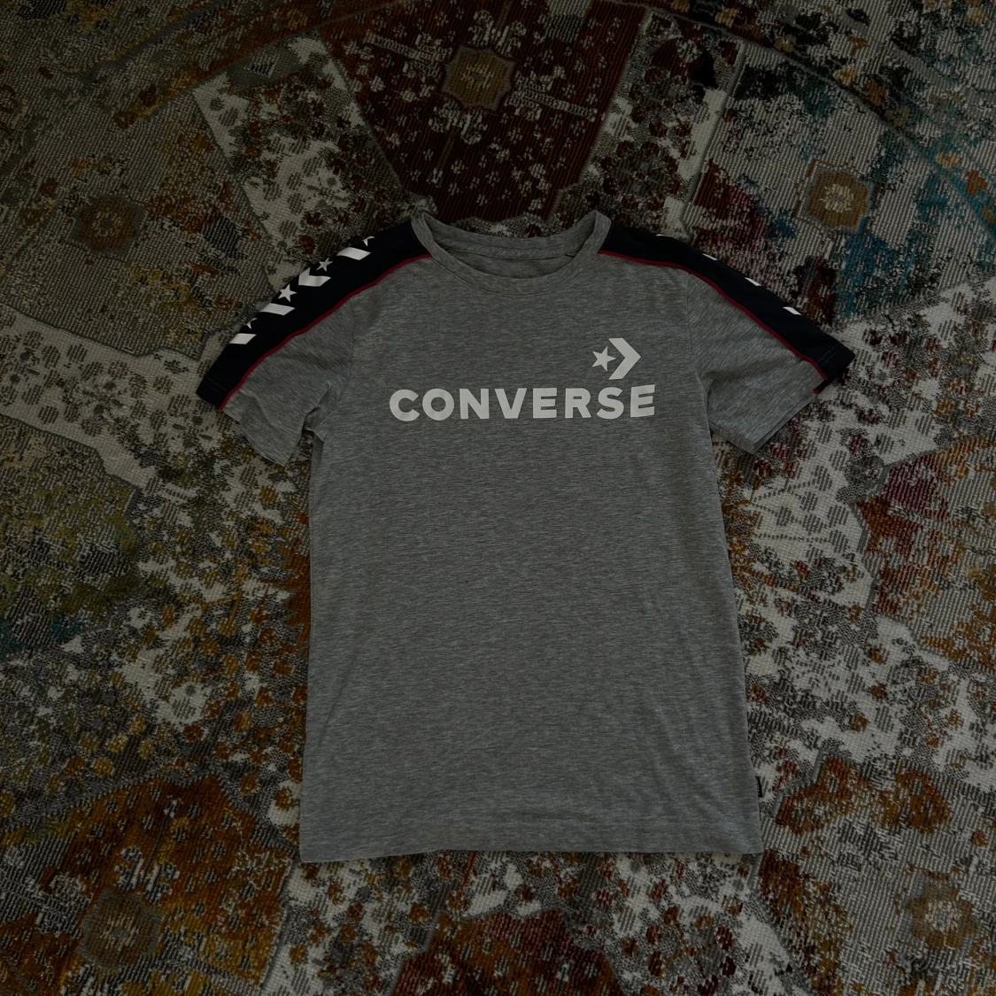 Snygg grå t-shirt från Converse med stort vitt logotryck framtill. Svarta och röda detaljer på axlarna med vita stjärnor ger en sportig vibe. Klassisk passform och rund halsringning. Perfekt för dig som gillar streetwear och vill sticka ut lite extra.