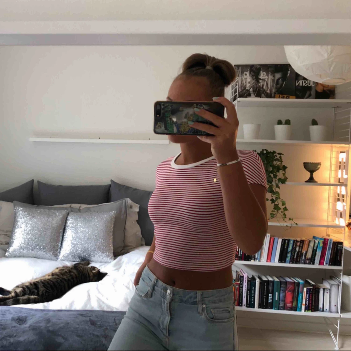 Första bilden är lånad. Svart vit randig med lite glesare ränder och en hel röd kvar. Sitter likadant som på första bilden. Super mjukt tyg. Storlek M men sitter lite mer som en S bara lite längre då den är lite croppad. Passar även M.