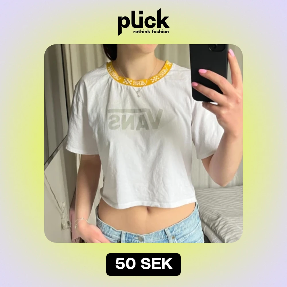 Supersnygg croppad t-shirt från vans med snygg detalj i kragen. Grått tryck fram. Sparsamt använd💛