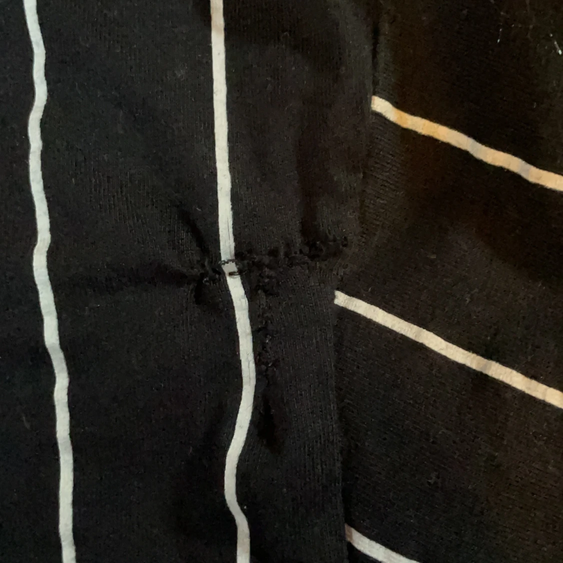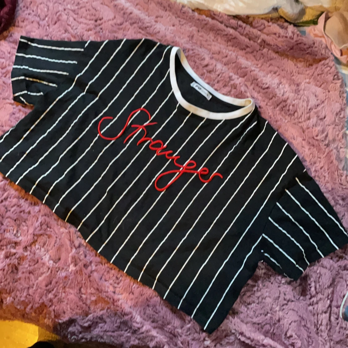 Svart, lite boxig croptop med vita ränder rött broderi med texten ”Stranger”. Köpt på New Yorker. Använd ca 5-7 gånger. Haft ett hål men lagat det (bild 3) och tycker inte det stör då det är på baksidan av axeln/nära axelsömmen. Har tvättats efter lagning och den håller. 💌Frakten är baserad på frimärken. Önskas postnords egna paket löser vi det.🎈