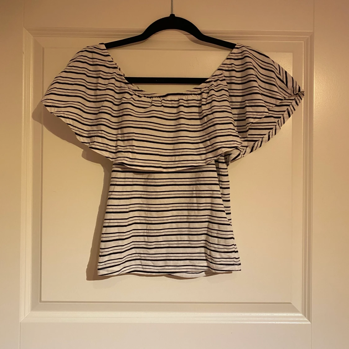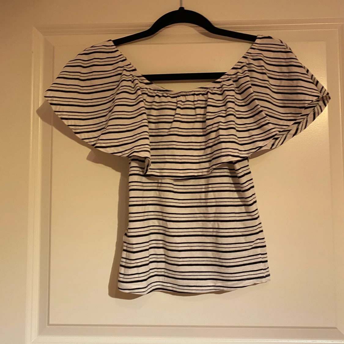 Vit och svart randig sommartopp, den går perfekt att ha den som off shoulder men man kan även ta upp den på axlarna. Skönt och mjukt material och perfekt för sommaren.