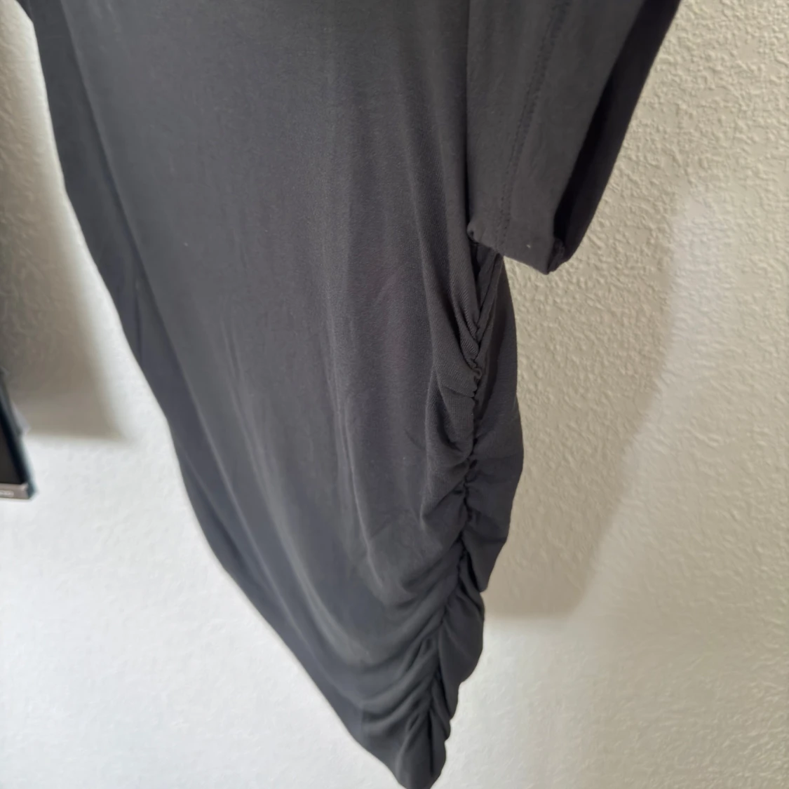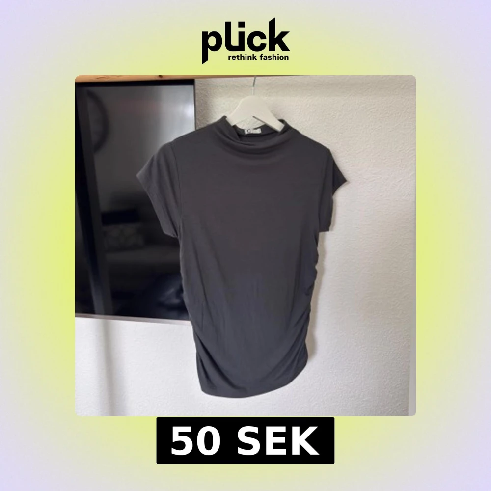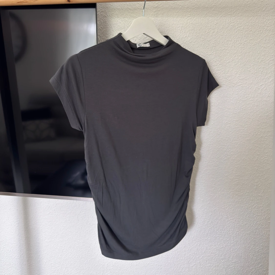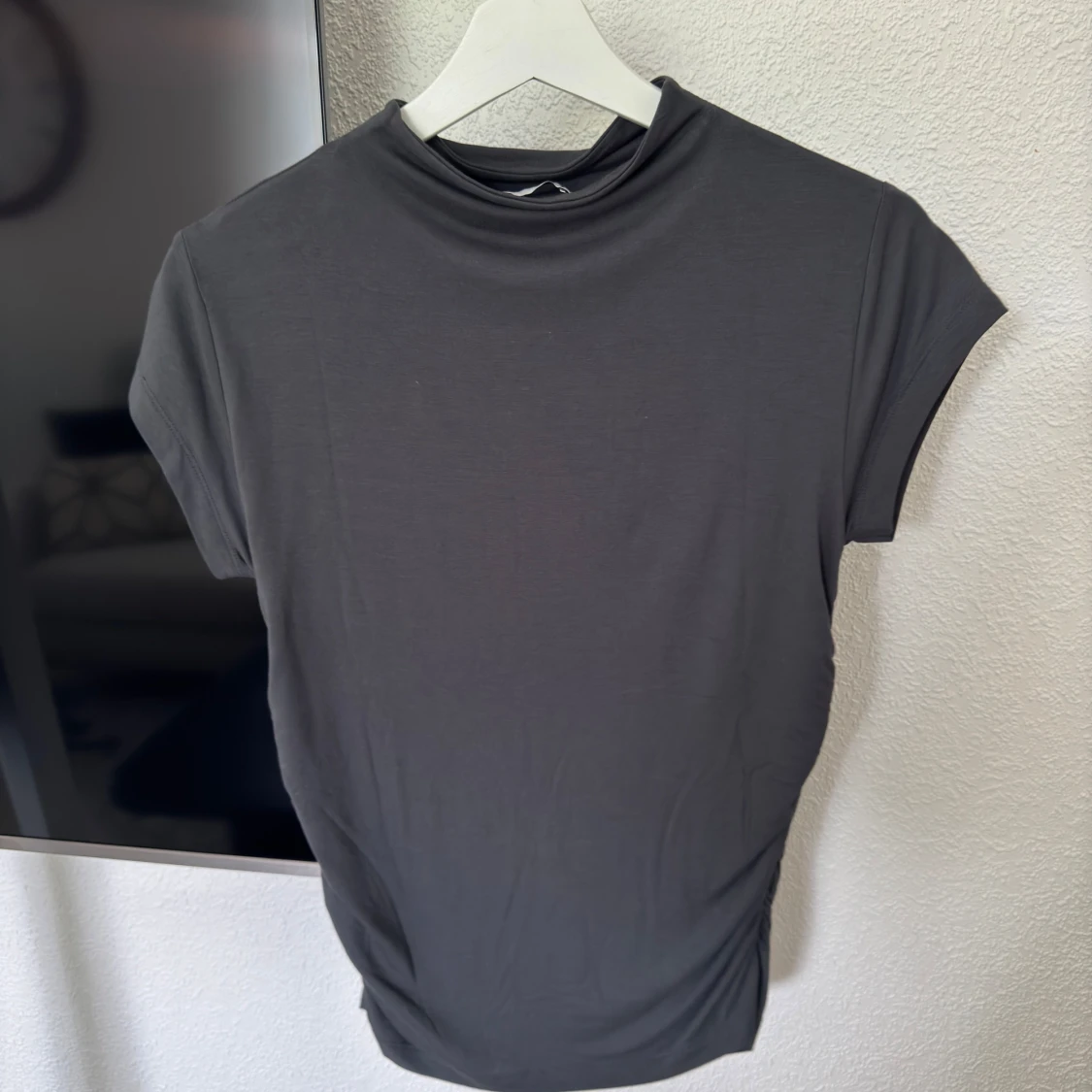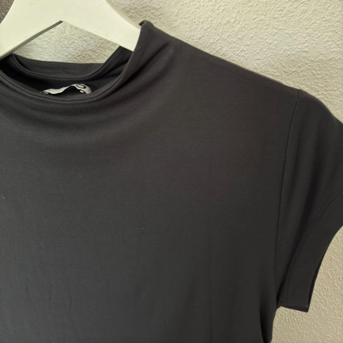 Mörkgrå T-shirt från Cubus med hög hals och korta ärmar. På båda sidorna finns de en rynkdetalj som är en perfekt detalj. T-shirten är tajt i passform och sitter väldigt fint på kroppen. Helt ny och har endast tagit av prislappen, säljer då den inte kommit till användning.