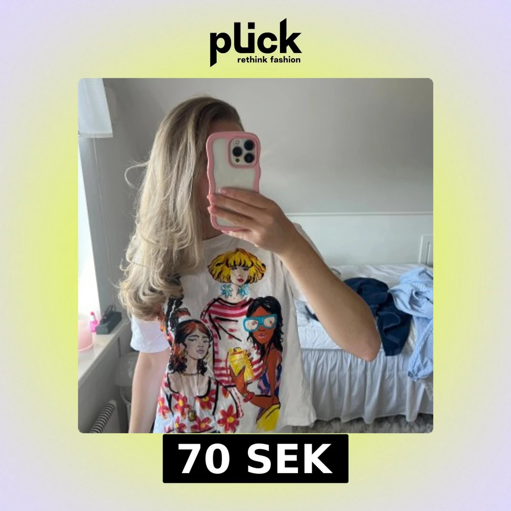 Säljer en vit t-shirt med ett färgglatt tryck av fyra stiliserade kvinnor i olika kläder och accessoarer. T-shirten har korta ärmar och en rund halsringning. Perfekt för en färgglad och unik stil!🩷🥺🫶🏼