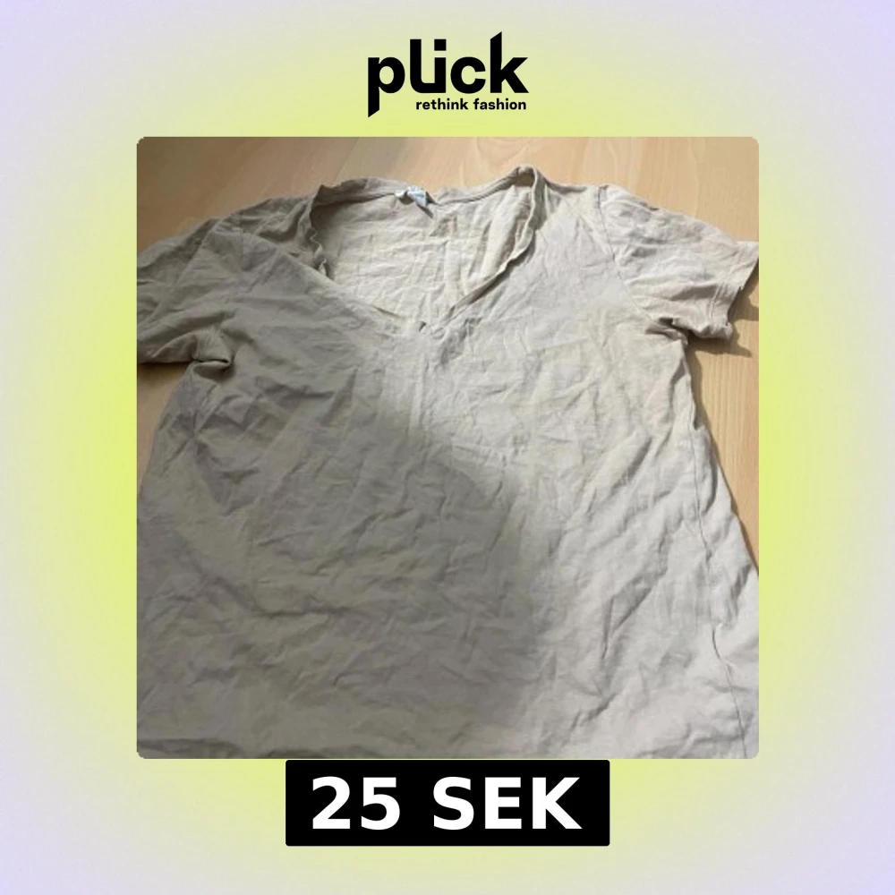Säljer en beige t-shirt från Amisu med v-ringning och korta ärmar. Perfekt basic-plagg som passar till det mesta. Tillverkad i mjukt material för en skön känsla.