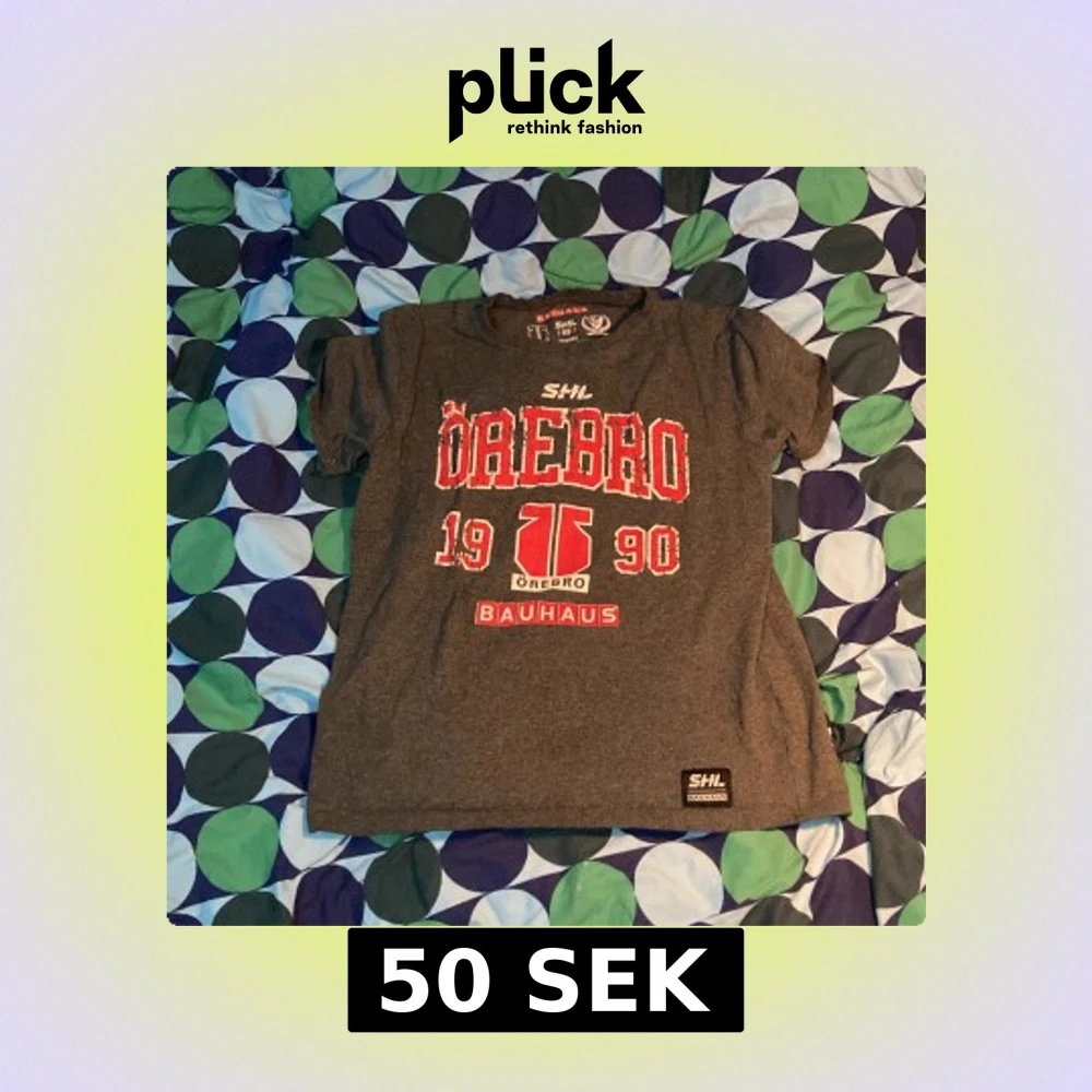 Säljer en grå t-shirt från SHL med stort tryck 'Örebro 1990' och Bauhaus-logga på bröstet. Perfekt för hockeyfans! Rund hals och korta ärmar. Skön och sportig stil.