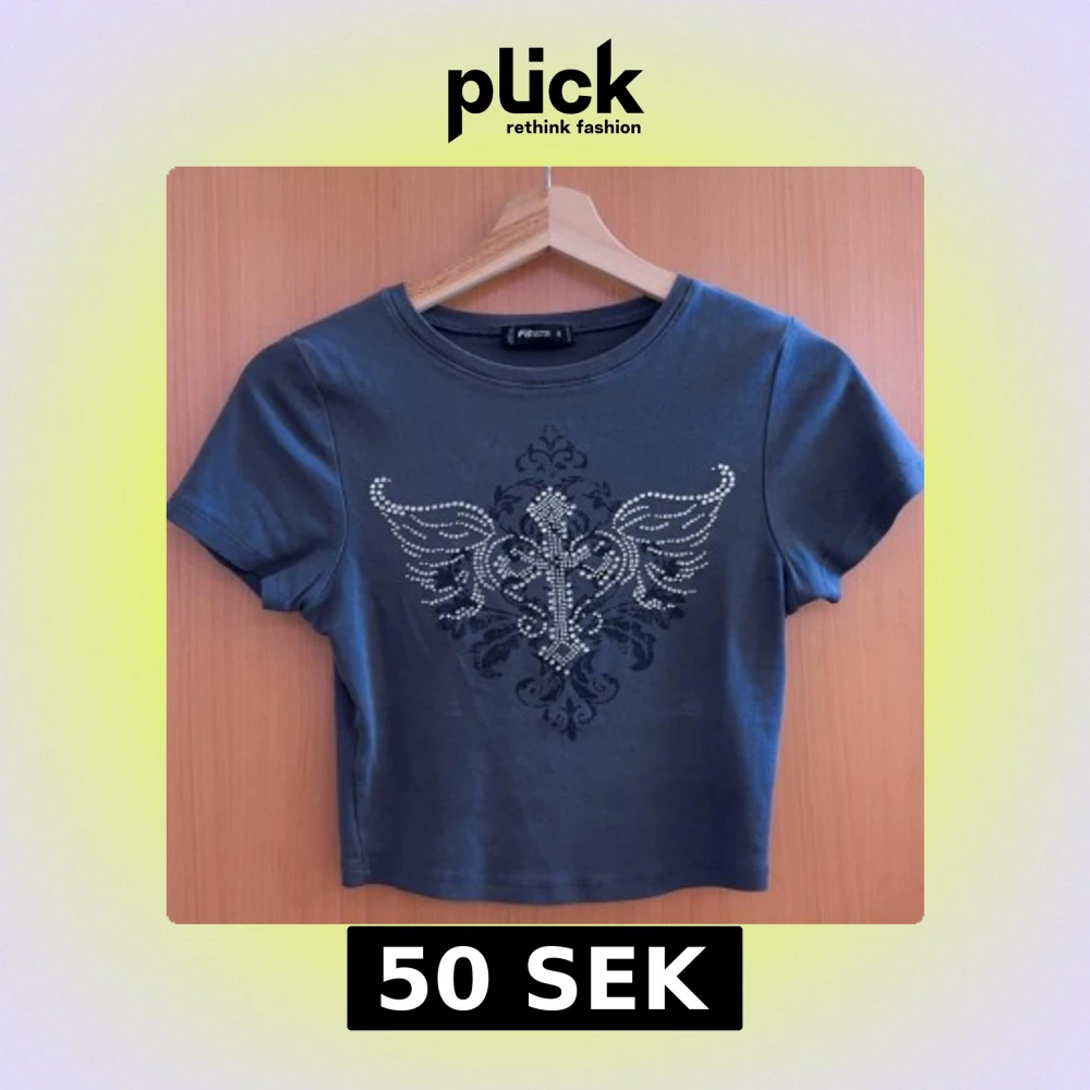 Snygg mörkgrå croppad t-shirt från FB Sister med korta ärmar. Framsidan har ett coolt tryck med vingar och kors i strass. Perfekt för dig som gillar edgy stil och vill sticka ut lite extra.