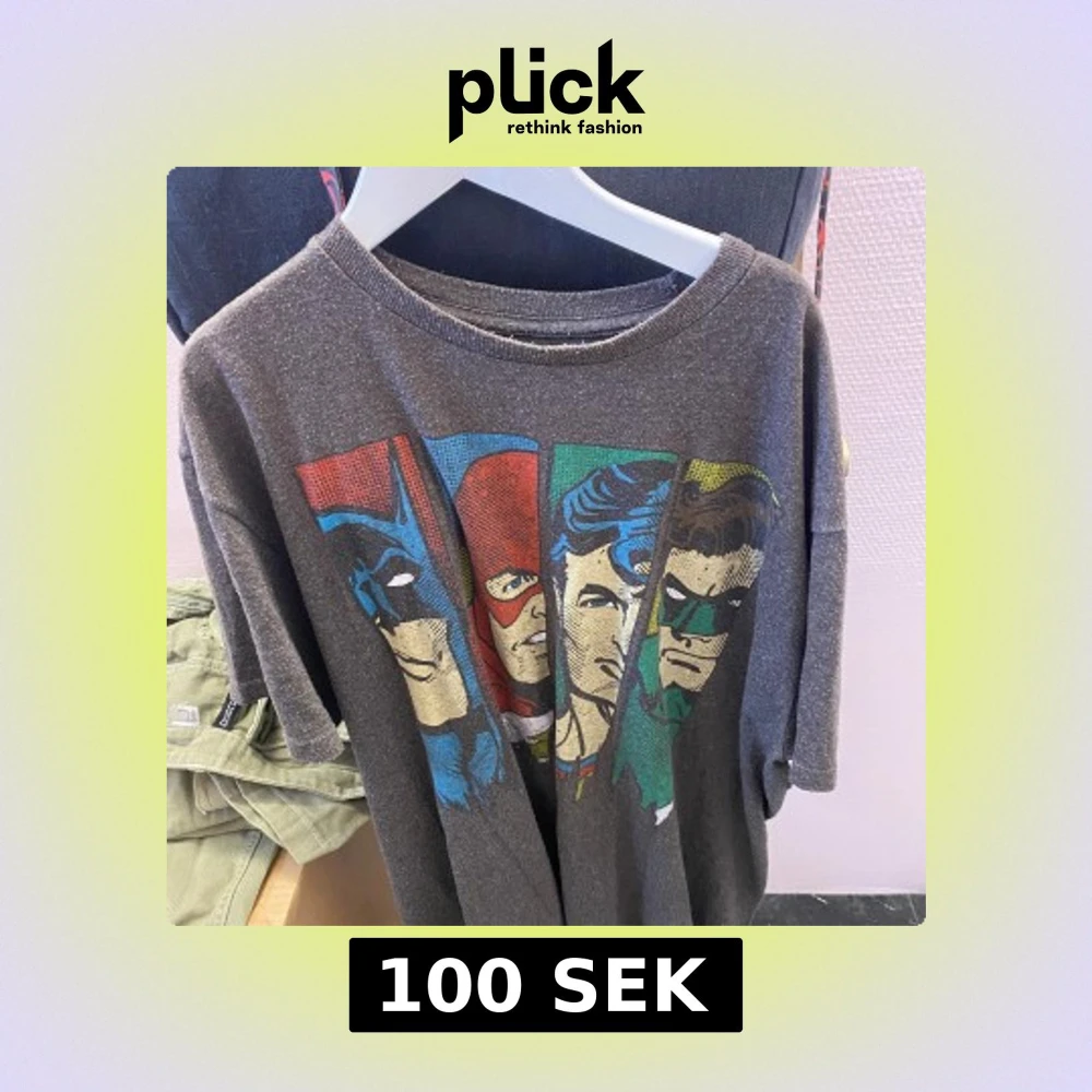 Säljer en grå t-shirt med tryck av tre kända superhjältar i färgerna blå, röd och grön. T-shirten har en normal passform och korta ärmar. Perfekt för alla som älskar serietidningar och superhjältar!