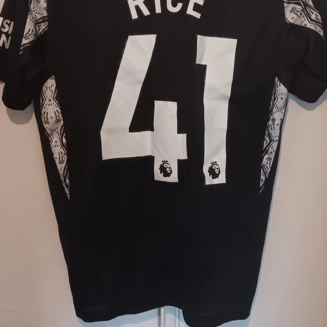 Svart Arsenal fotbollströja från Adidas med grönt och rött tryck på bröstet, Emirates Fly Better sponsorlogga och vita detaljer på sidorna. Ryggen har Rice och nummer 41 i vitt. Slim fit, kortärmad och tillverkad i lätt funktionsmaterial.