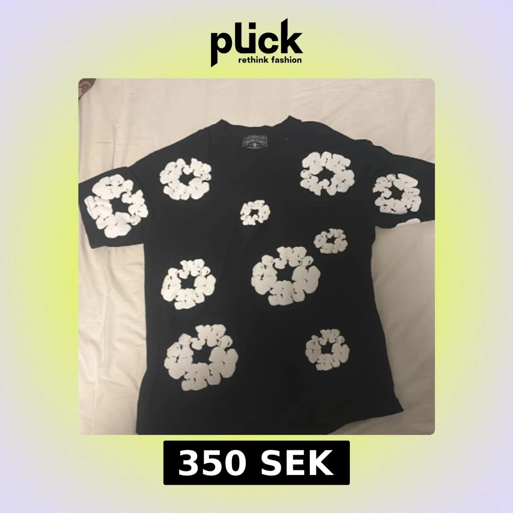 Svart t-shirt från Denim Tears med stora vita blommönster tryckta över hela plagget, både fram och bak. Klassisk rund hals och korta ärmar. Materialet är mjuk bomull som känns skönt mot huden. Perfekt statement-plagg för dig som gillar unik design.