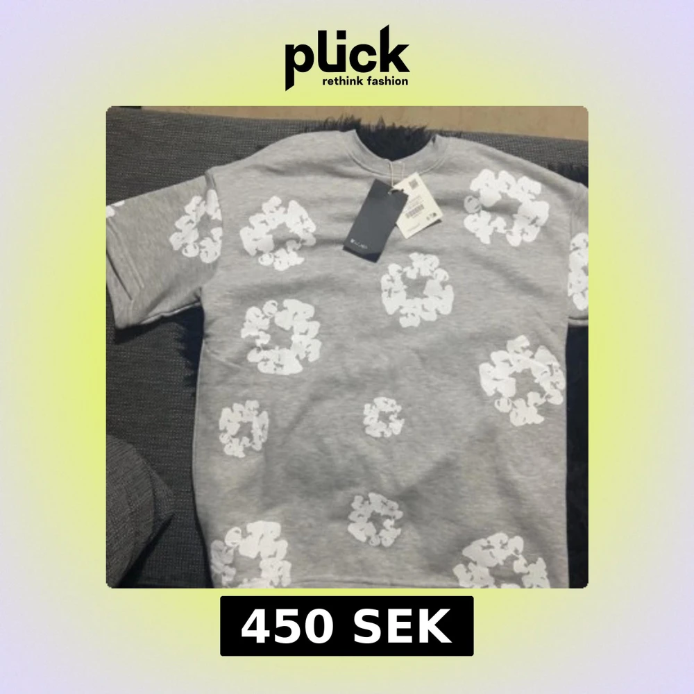 Grå t-shirt med vita blommiga tryck över hela plagget. Klassisk rund halsringning och korta ärmar. Tillverkad i mjuk bomull för en skön och avslappnad känsla. Perfekt för dig som gillar streetwear med unik twist.