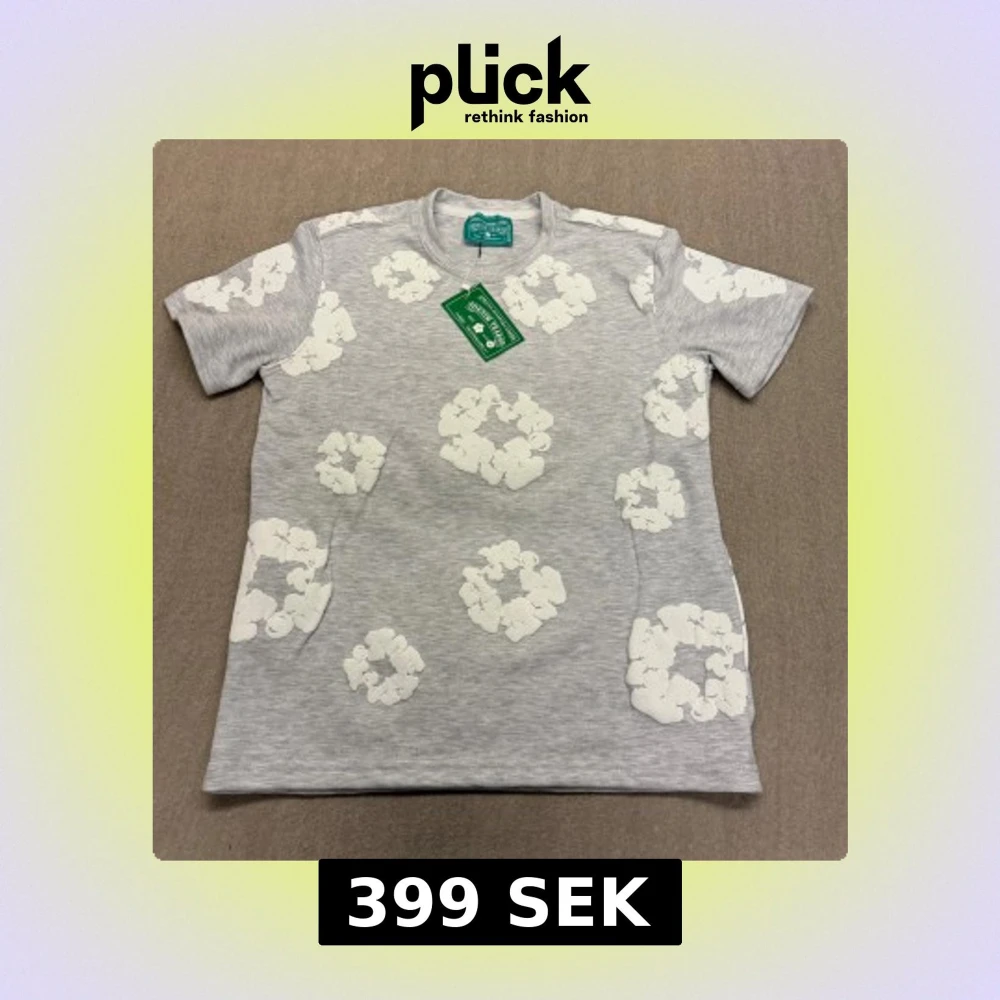 Snygg grå t-shirt från Denim Tears med vita blommiga tryck över hela plagget. Klassisk rund hals och korta ärmar. Tillverkad i mjuk bomull som känns skön mot huden. Perfekt för dig som vill sticka ut med en unik och trendig look. Storleken är S men den är lite liten i storleken så skulle säga att den passar nån som har storlek XS