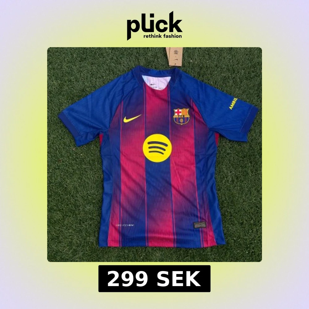 FC Barcelona matchtröja från Nike med klassiska blå och röda ränder, gult Nike-märke och Spotify-logga på bröstet. Tillverkad i lätt, ventilerande Dri-FIT-material. Klubbmärke på bröstet och UNHCR-tryck på ryggen. Perfekt för dig som älskar fotboll och Barca.
