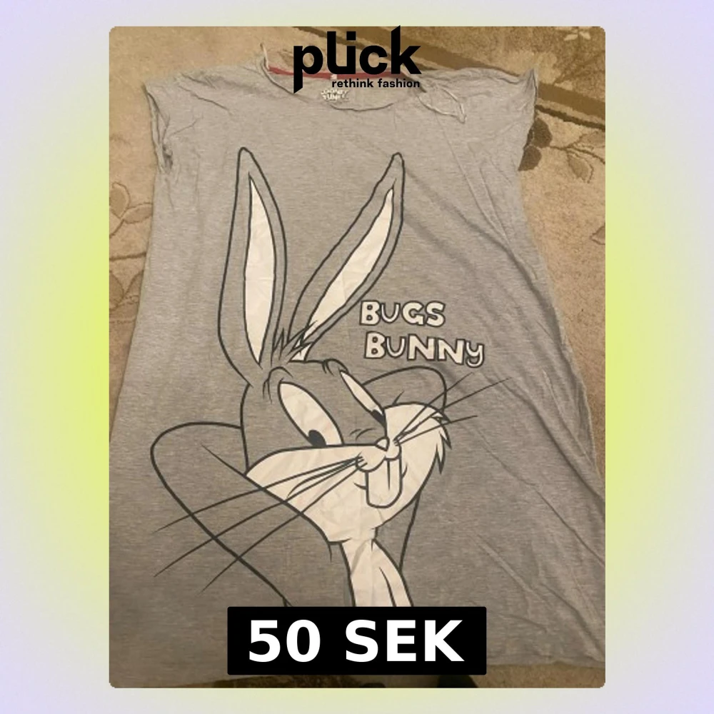 Säljer en grå t-shirt från Looney Tunes med stor Bugs Bunny-print på framsidan. T-shirten har korta ärmar och en röd detalj vid halsen. Materialet är mjuk bomull, perfekt för dig som gillar tecknade motiv och chill stil.