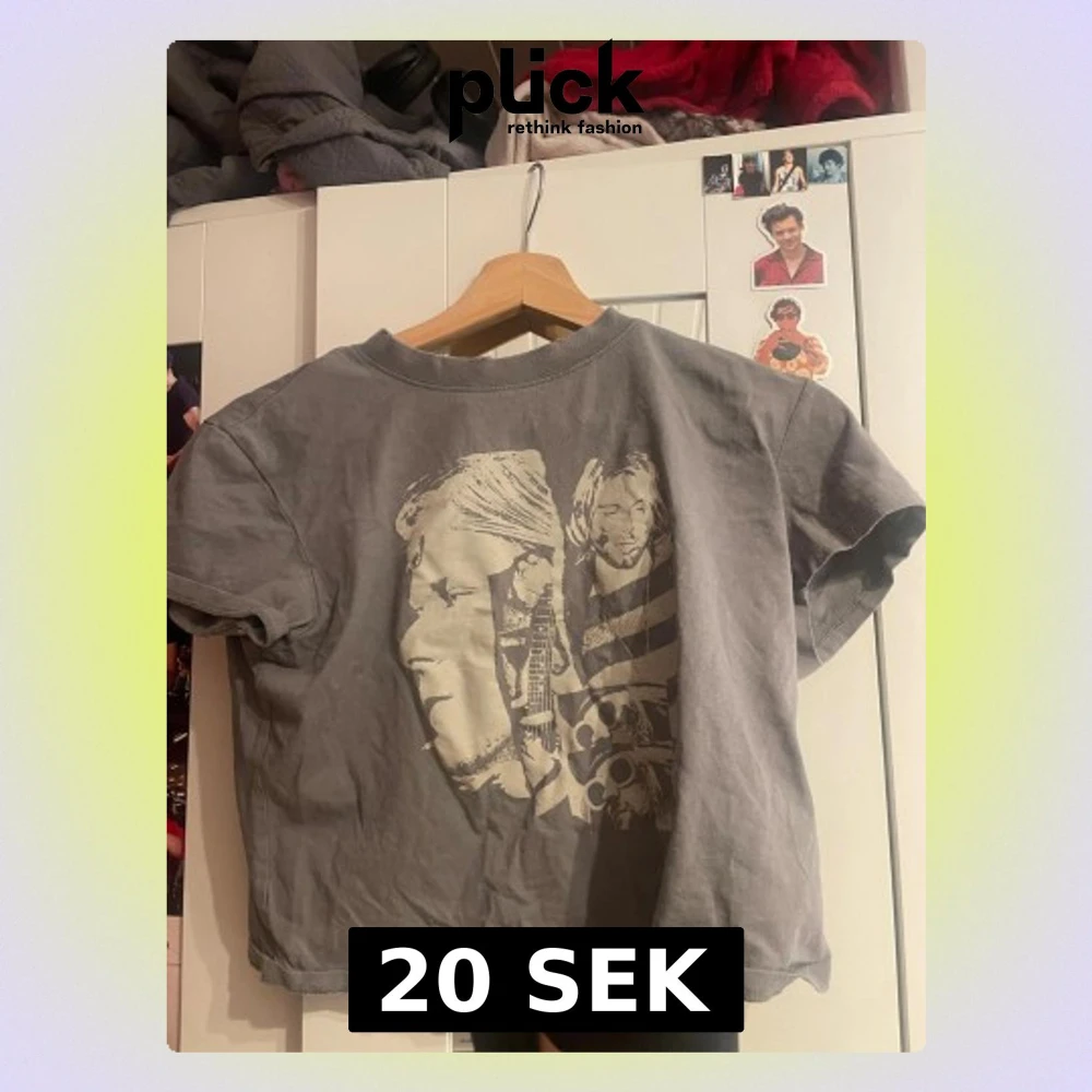 Cool grå t-shirt med ett stort tryck på kurt cobain på framsidan. T-shirten har korta ärmar och en klassisk rund hals. Perfekt för dig som gillar streetstyle och unika motiv. T-shirten är lite som en magtröja och börjar ungefär vid naveln.