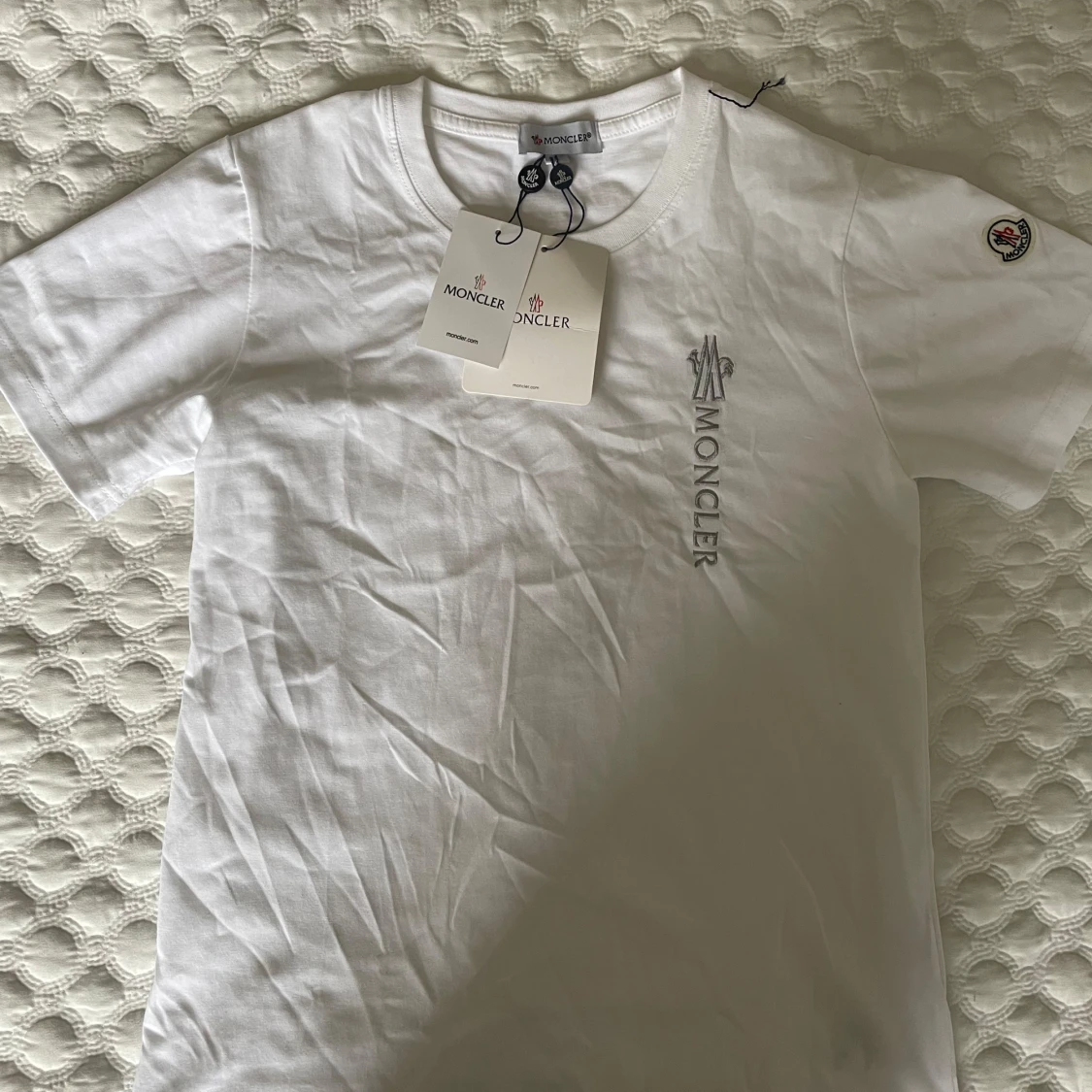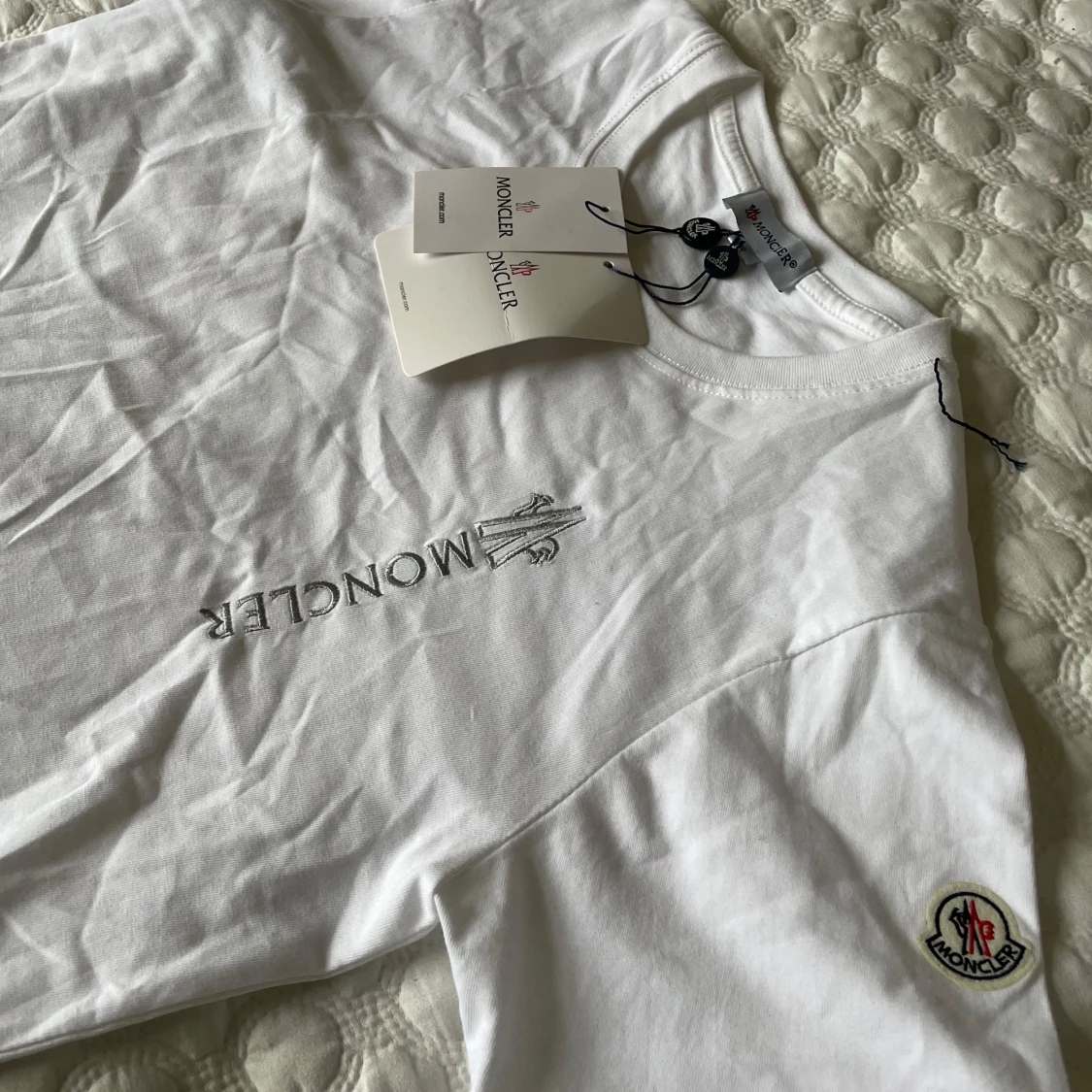Vit t-shirt från Moncler i mjuk bomull med broderad Moncler-logga i grått på bröstet och klassisk patch på ärmen. T-shirten har rund halsringning och korta ärmar. Perfekt för dig som gillar stilrena och exklusiva plagg.